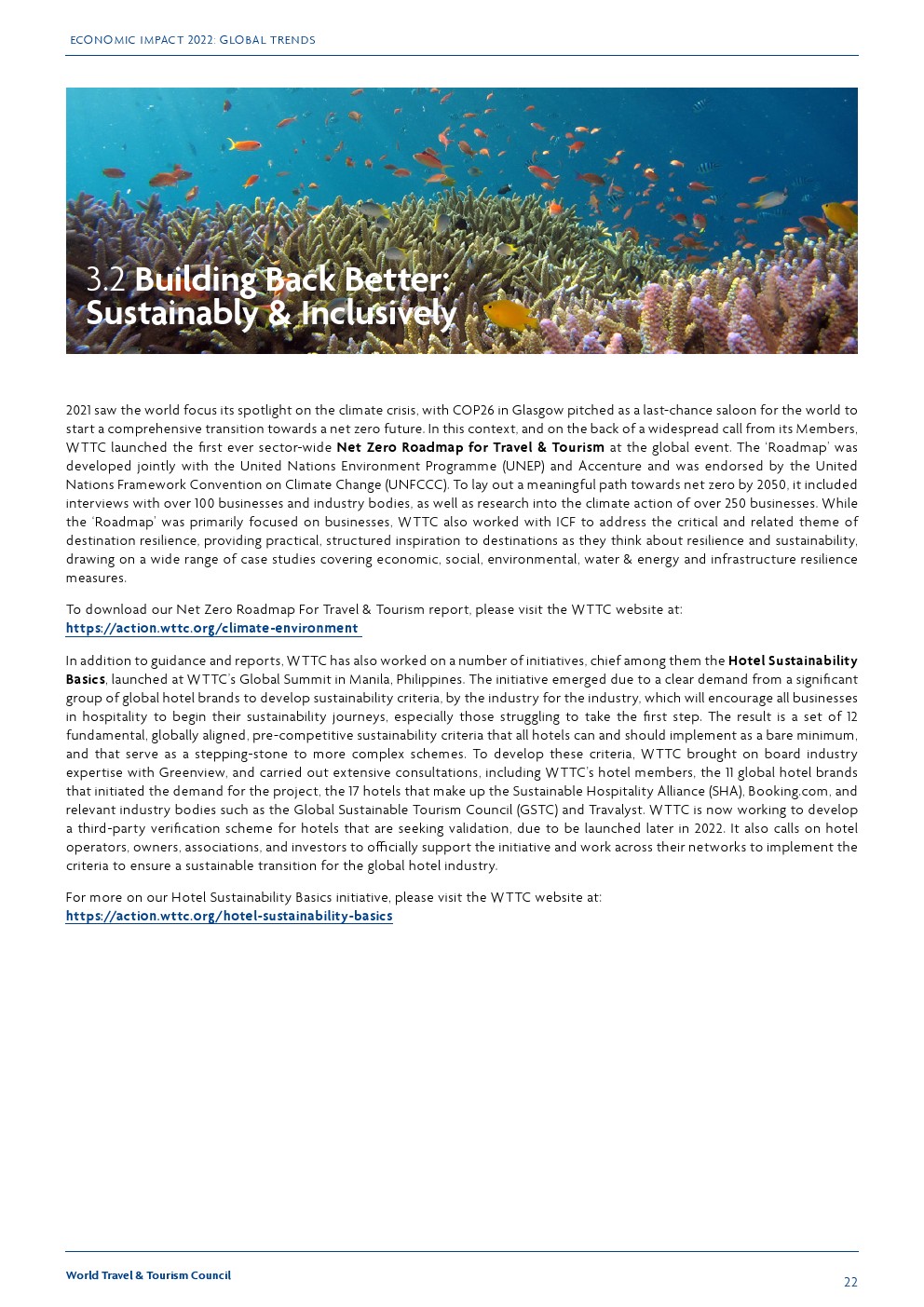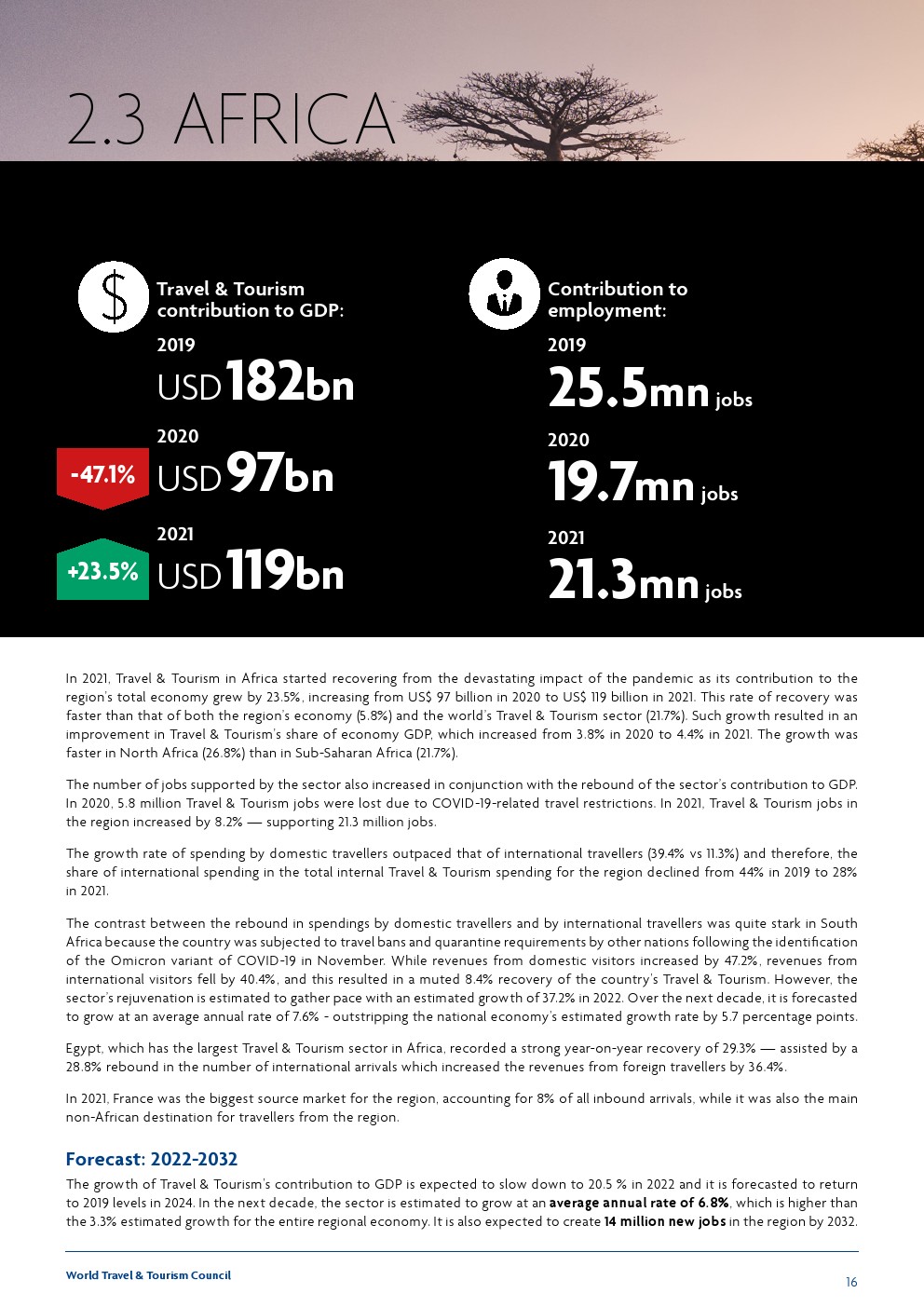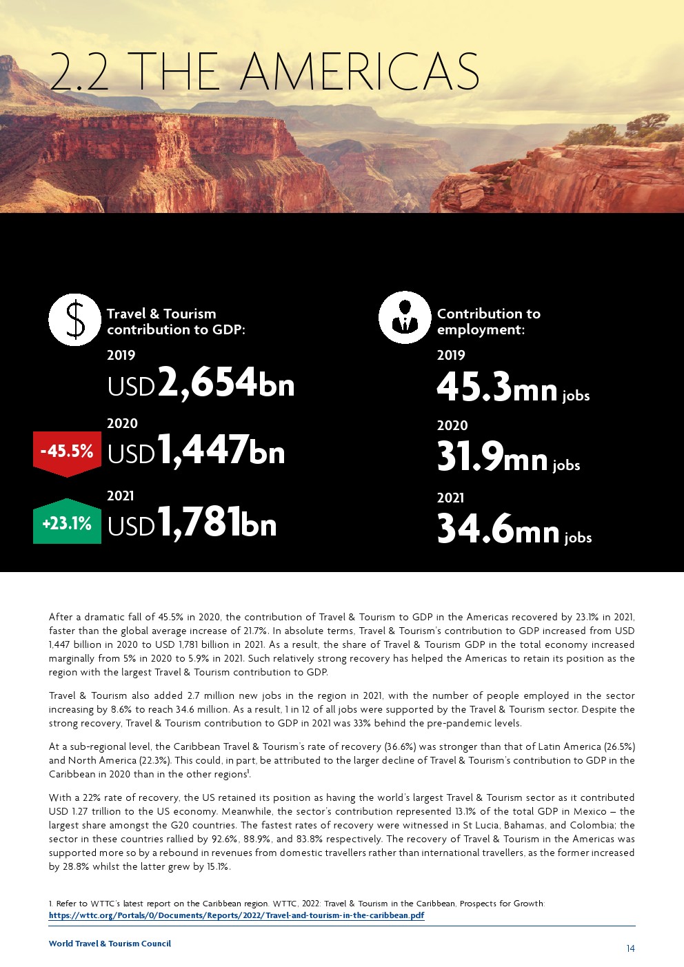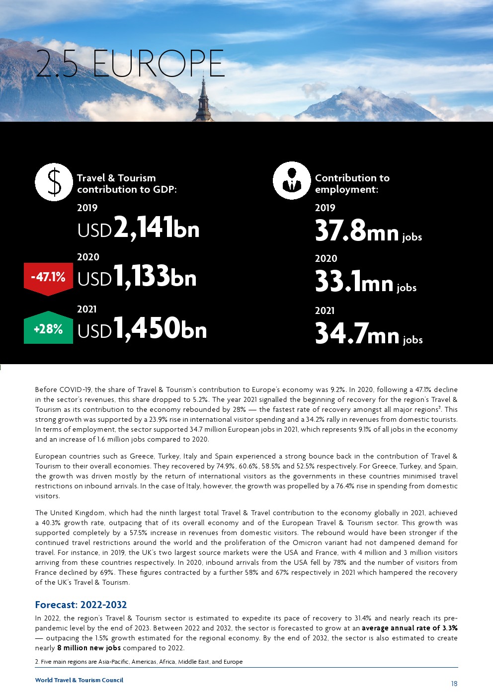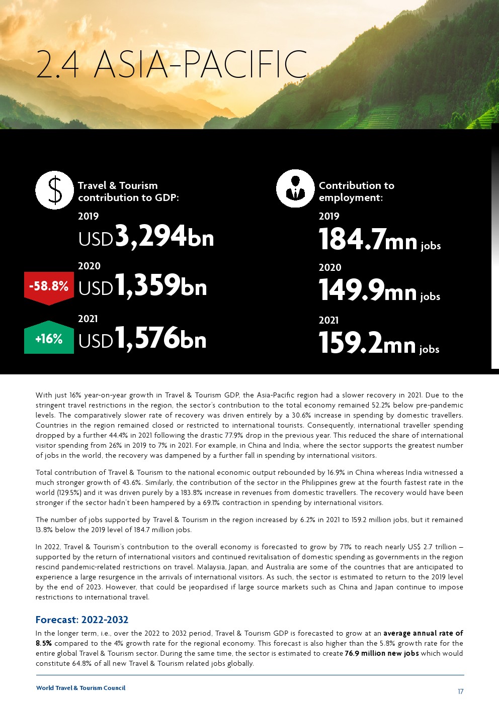 虽然 2021 年全球旅游业开始复苏,但速度低于预期,部分原因是 Omicron 变体的影响、严格且不一致的边境限制以及政府之间缺乏应对这一流行病的协调性。 旅游业对 GDP 的贡献在 2021 年增长了 1 万亿美元(+21.7%),达到 5.8 万亿美元,而该行业在整个经济中的份额从 2020 年的 5.3%增长到 2021 年的 6.1%。此外,该行业恢复就业岗位1820万个,同比增长6.7%。
