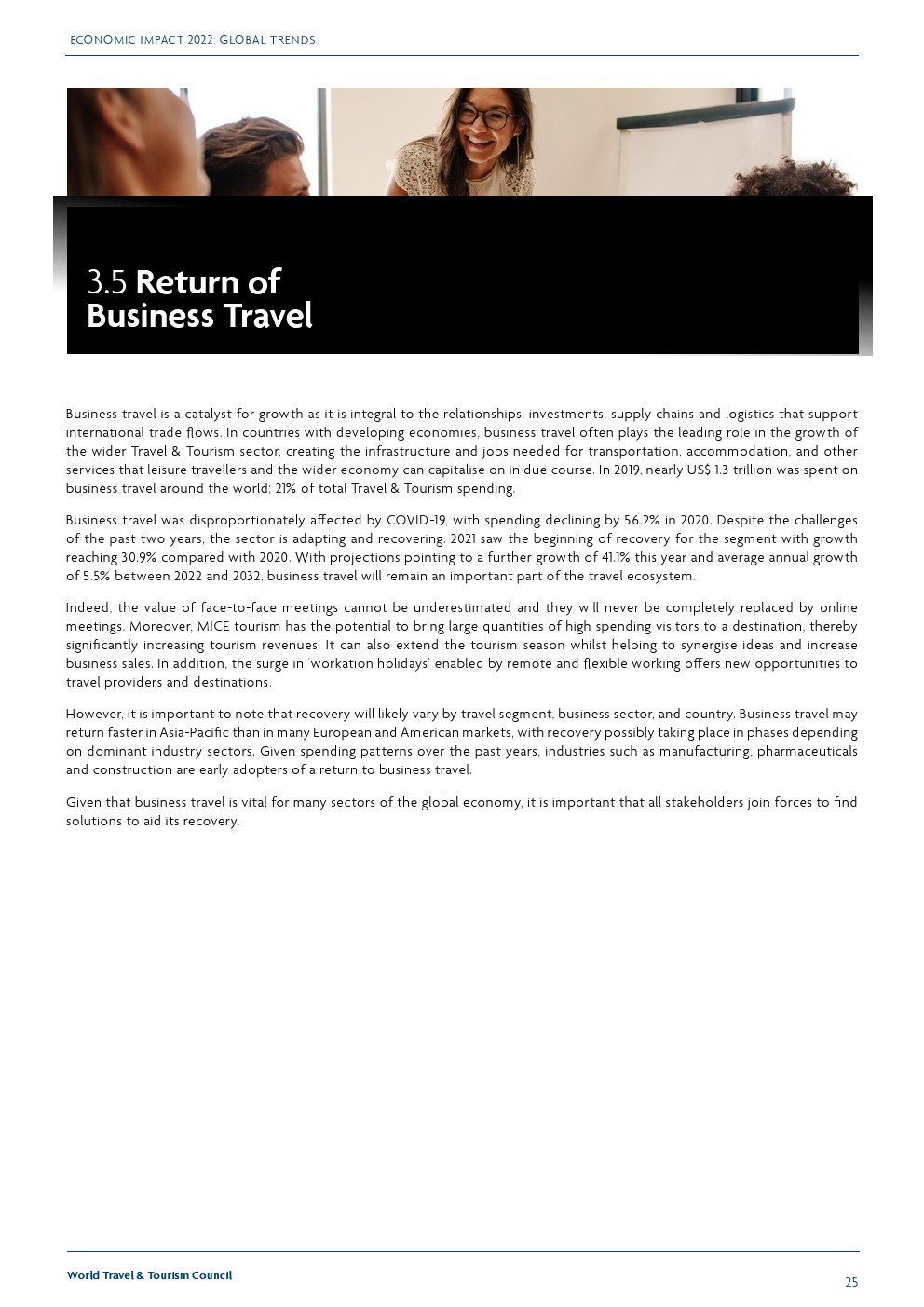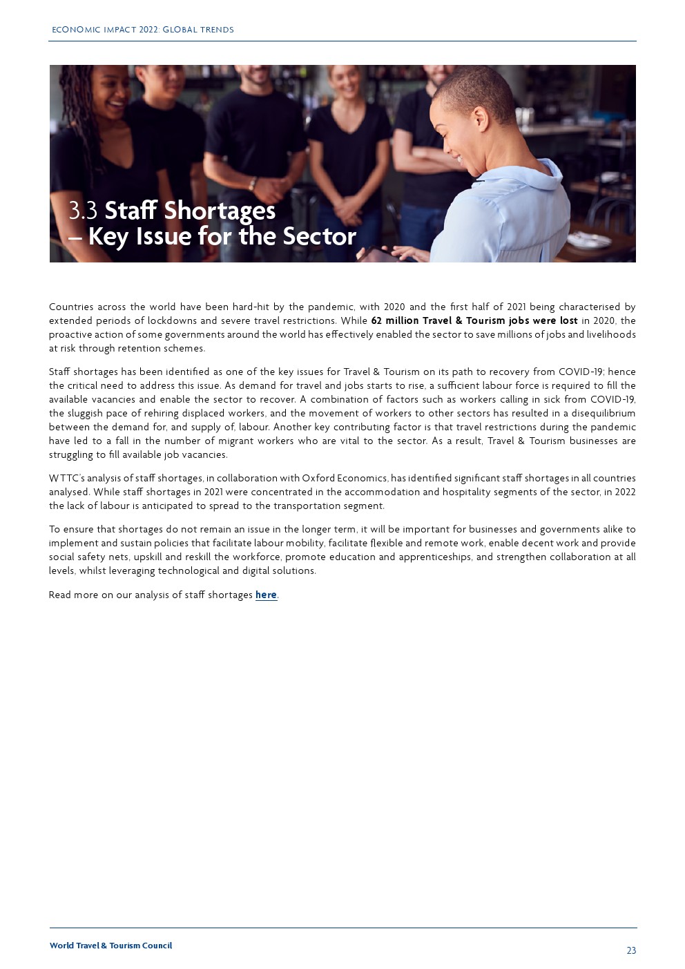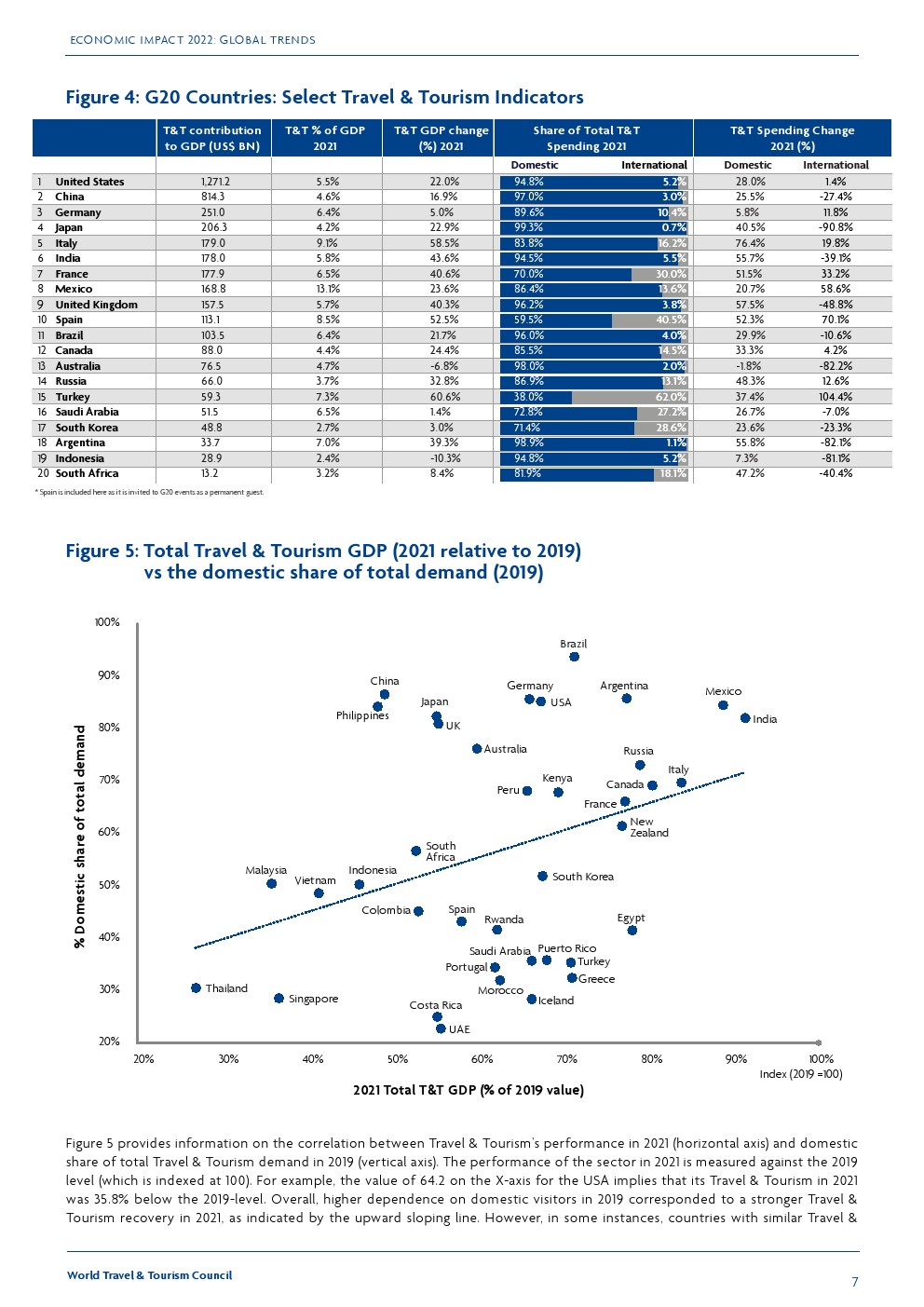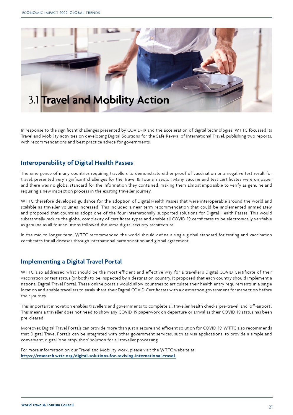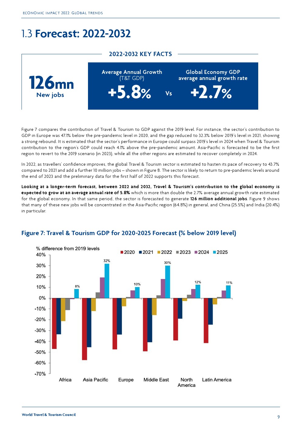 虽然 2021 年全球旅游业开始复苏,但速度低于预期,部分原因是 Omicron 变体的影响、严格且不一致的边境限制以及政府之间缺乏应对这一流行病的协调性。 旅游业对 GDP 的贡献在 2021 年增长了 1 万亿美元(+21.7%),达到 5.8 万亿美元,而该行业在整个经济中的份额从 2020 年的 5.3%增长到 2021 年的 6.1%。此外,该行业恢复就业岗位1820万个,同比增长6.7%。