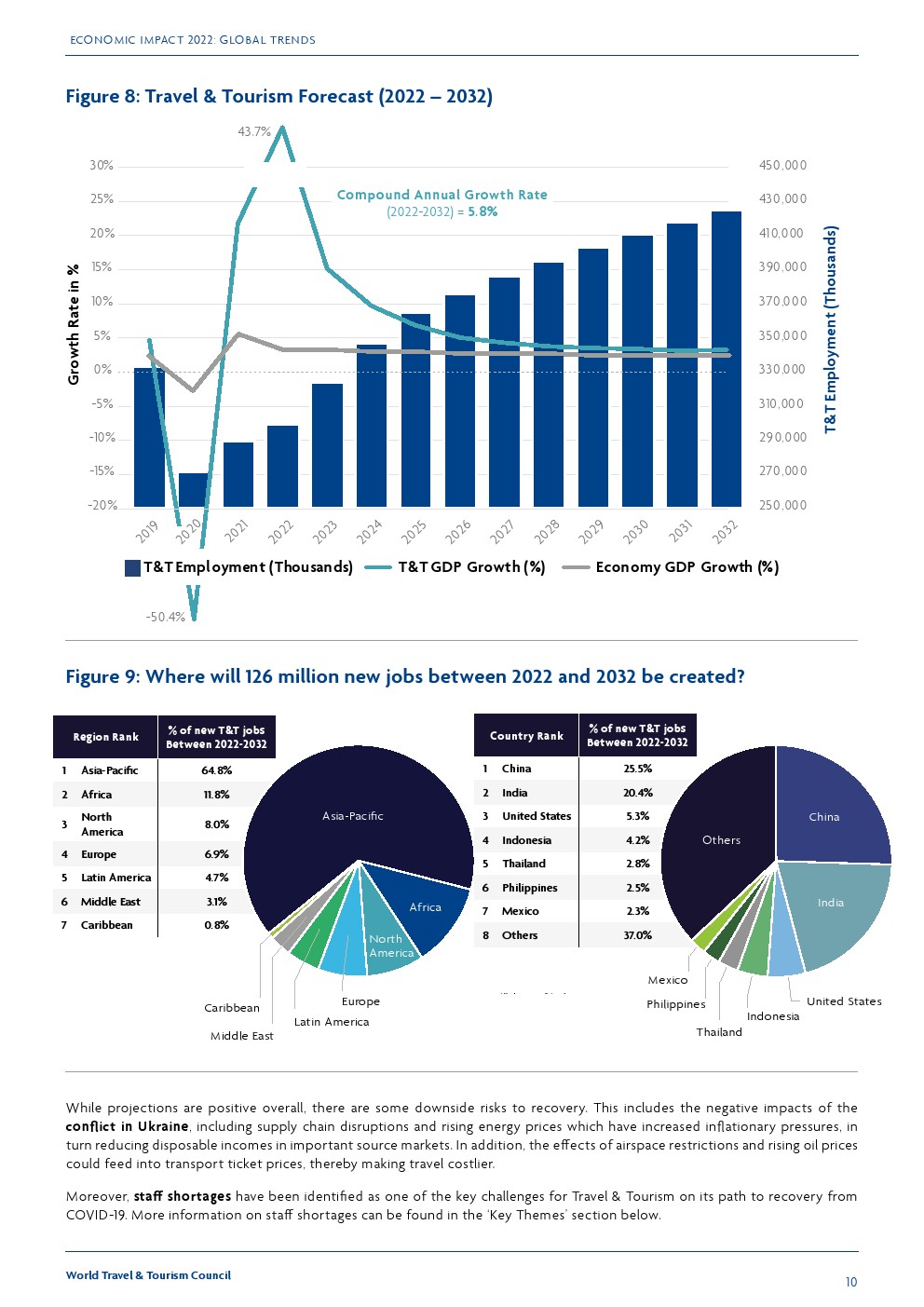 未来前景是乐观的,旅游行业再次显示出它的韧性和反弹能力。尽管该行业一直面临困难,但预测表明该行业将迎来强劲的十年增长。从 2022 年到 2032 年,旅游业 GDP 将以年均 5.8%的速度增长,超过整体经济的增长速度(2.7%)。 世界旅游理事会的研究表明,到 2023 年底,旅游业 GDP 可能会恢复到 2019 年的水平。此外,该行业预计将在未来十年内创造近 1.26 亿个新工作岗位。