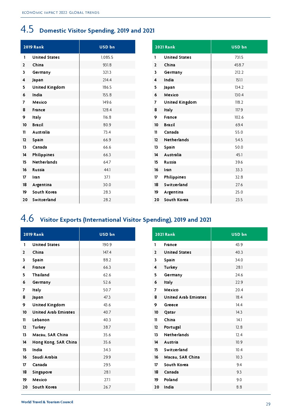 世界旅游理事会发布了“2022年旅游经济影响报告”。在大流行之前,旅游业是世界上最大的行业之一,占全球所有新增就业岗位的1/4,占所有就业岗位的 10.3%(3.33 亿个), 以及全球 GDP 的 10.3%,即9.6万亿美元。与此同时,2019 年国际游客支出达到1.8万亿美元,占出口总额的6.8%。