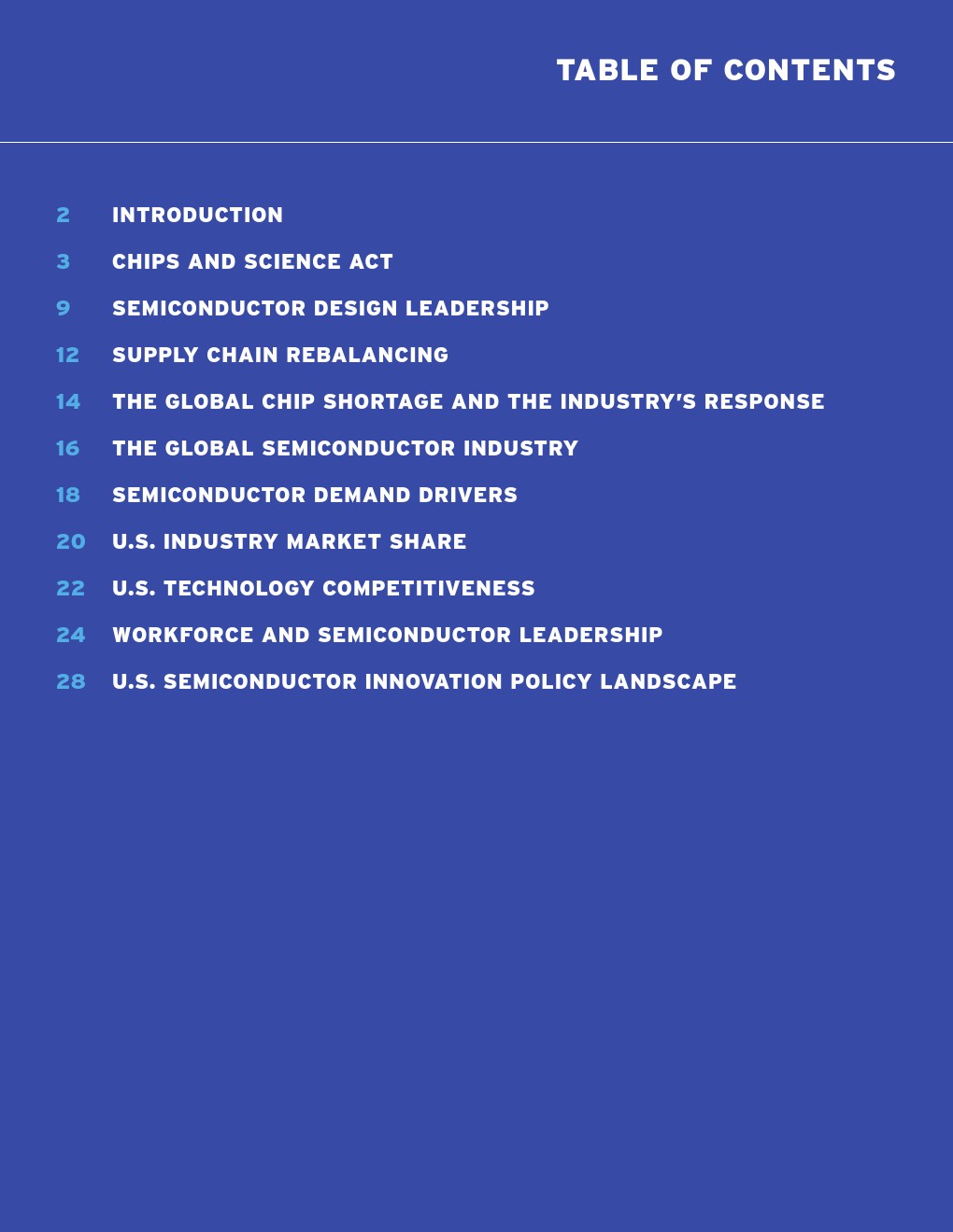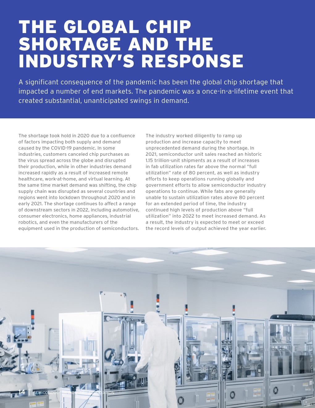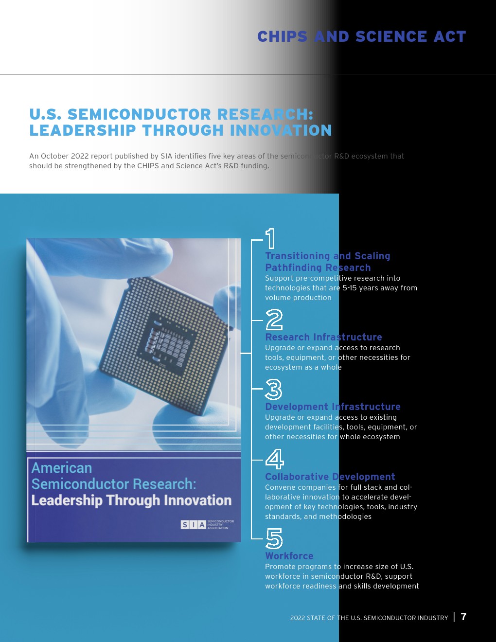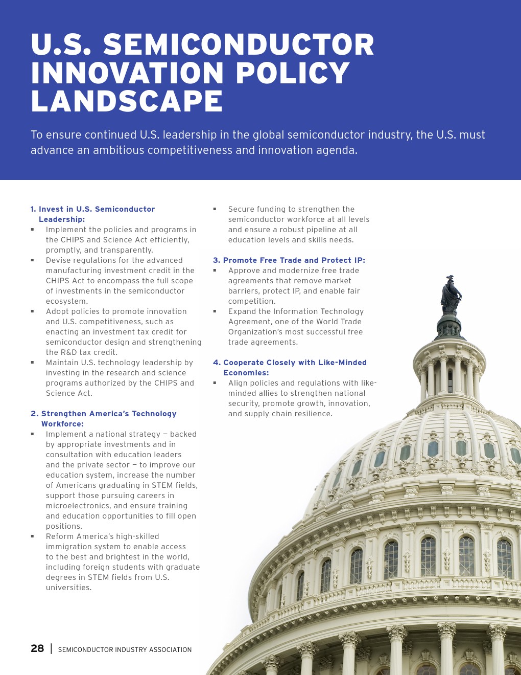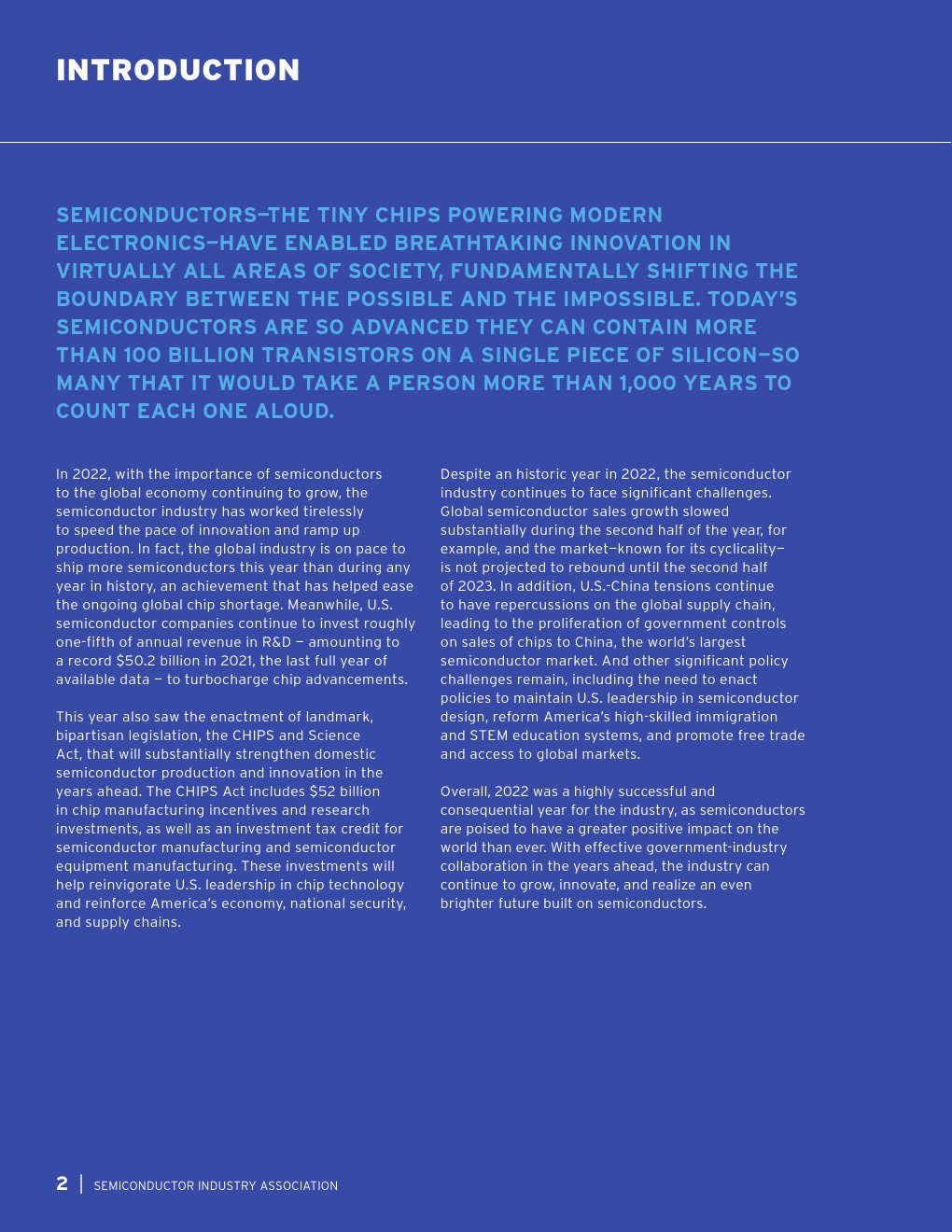 尽管 2022 年是具有历史意义的一年,但半导体行业继续面临着重大挑战。例如,下半年全球半导体销售增长大幅放缓,按照市场的周期性规律预计要到 2023 年下半年才会反弹。此外,中美紧张局势继续对半导体行业产生影响,尤其是全球供应链。这些导致美国政府对向全球最大的半导体市场——中国销售芯片的限制扩散。其他重大政策挑战依然存在,包括需要制定政策以保持美国在半导体设计领域的领先地位,改革美国的高技能移民和 STEM 教育体系,以及促进自由贸易和进入全球市场等。