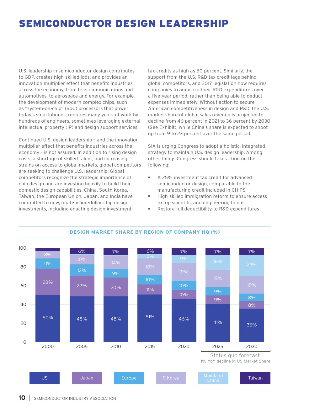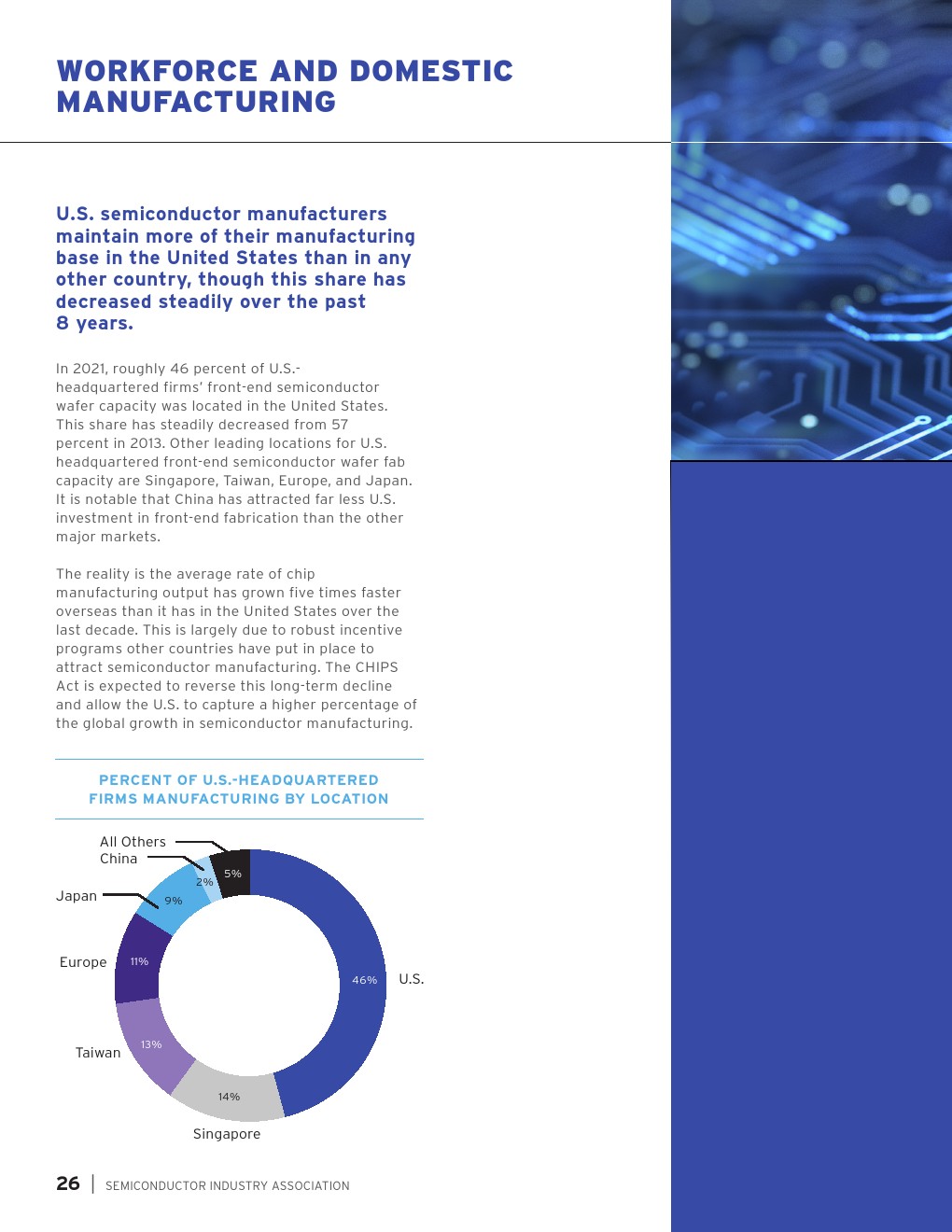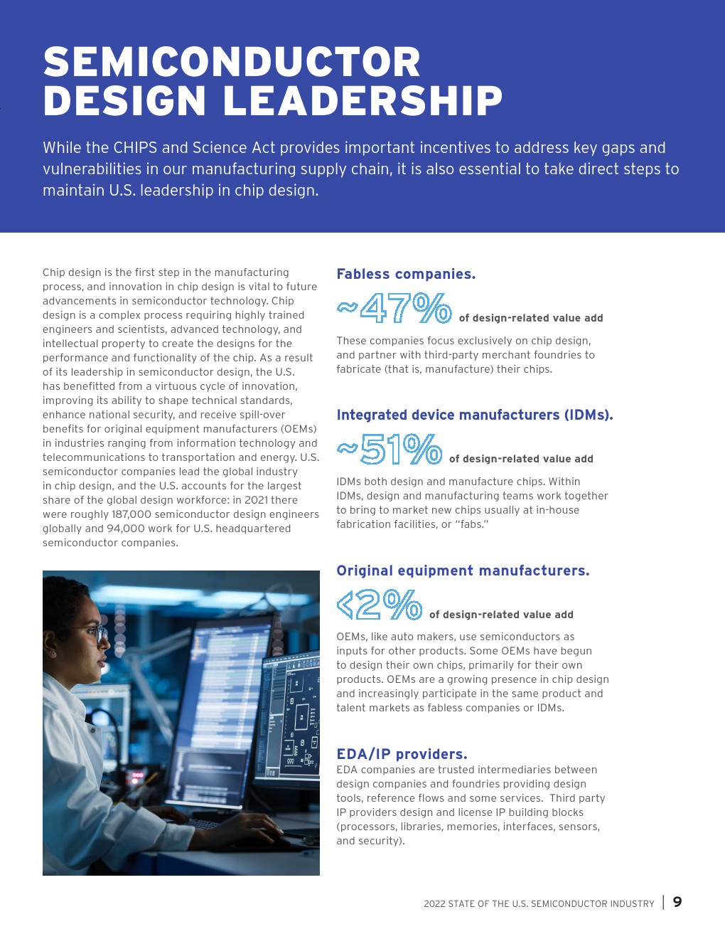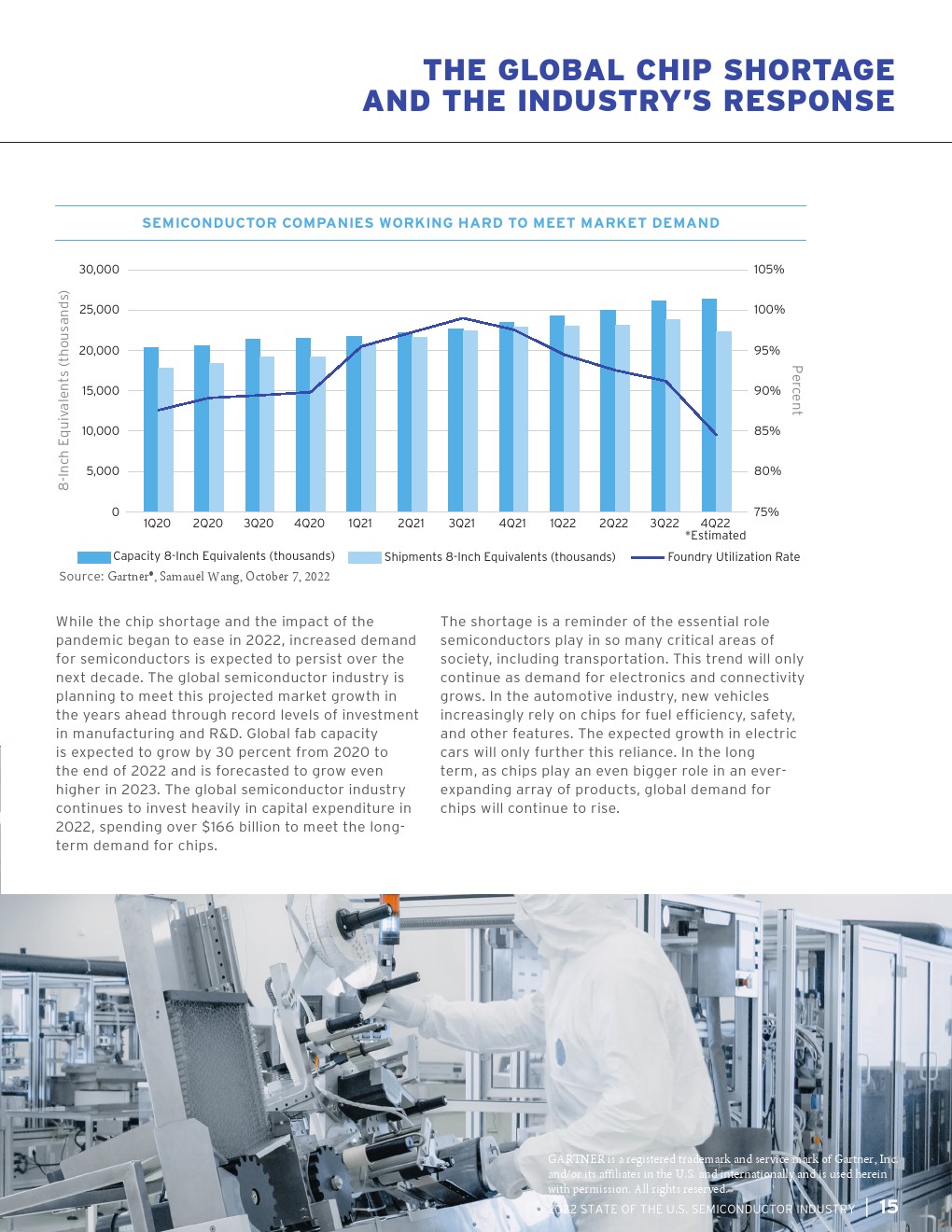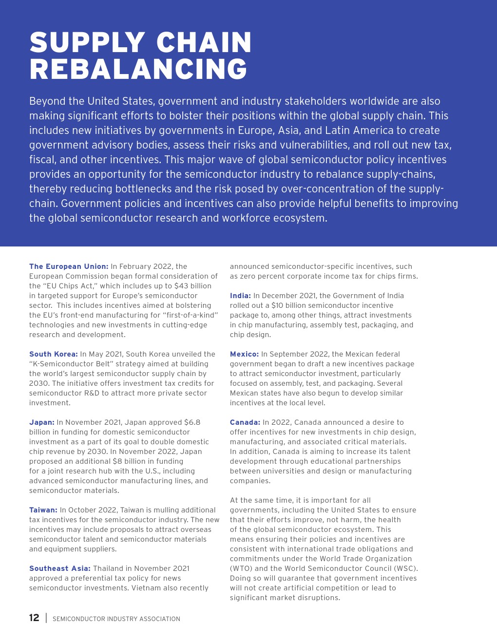尽管 2022 年是具有历史意义的一年,但半导体行业继续面临着重大挑战。例如,下半年全球半导体销售增长大幅放缓,按照市场的周期性规律预计要到 2023 年下半年才会反弹。此外,中美紧张局势继续对半导体行业产生影响,尤其是全球供应链。这些导致美国政府对向全球最大的半导体市场——中国销售芯片的限制扩散。其他重大政策挑战依然存在,包括需要制定政策以保持美国在半导体设计领域的领先地位,改革美国的高技能移民和 STEM 教育体系,以及促进自由贸易和进入全球市场等。