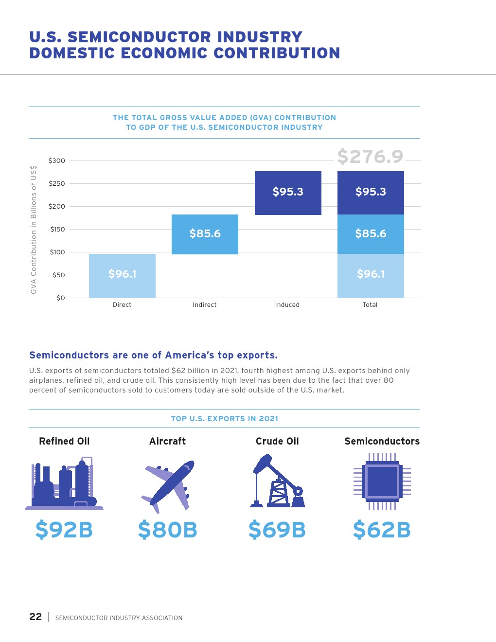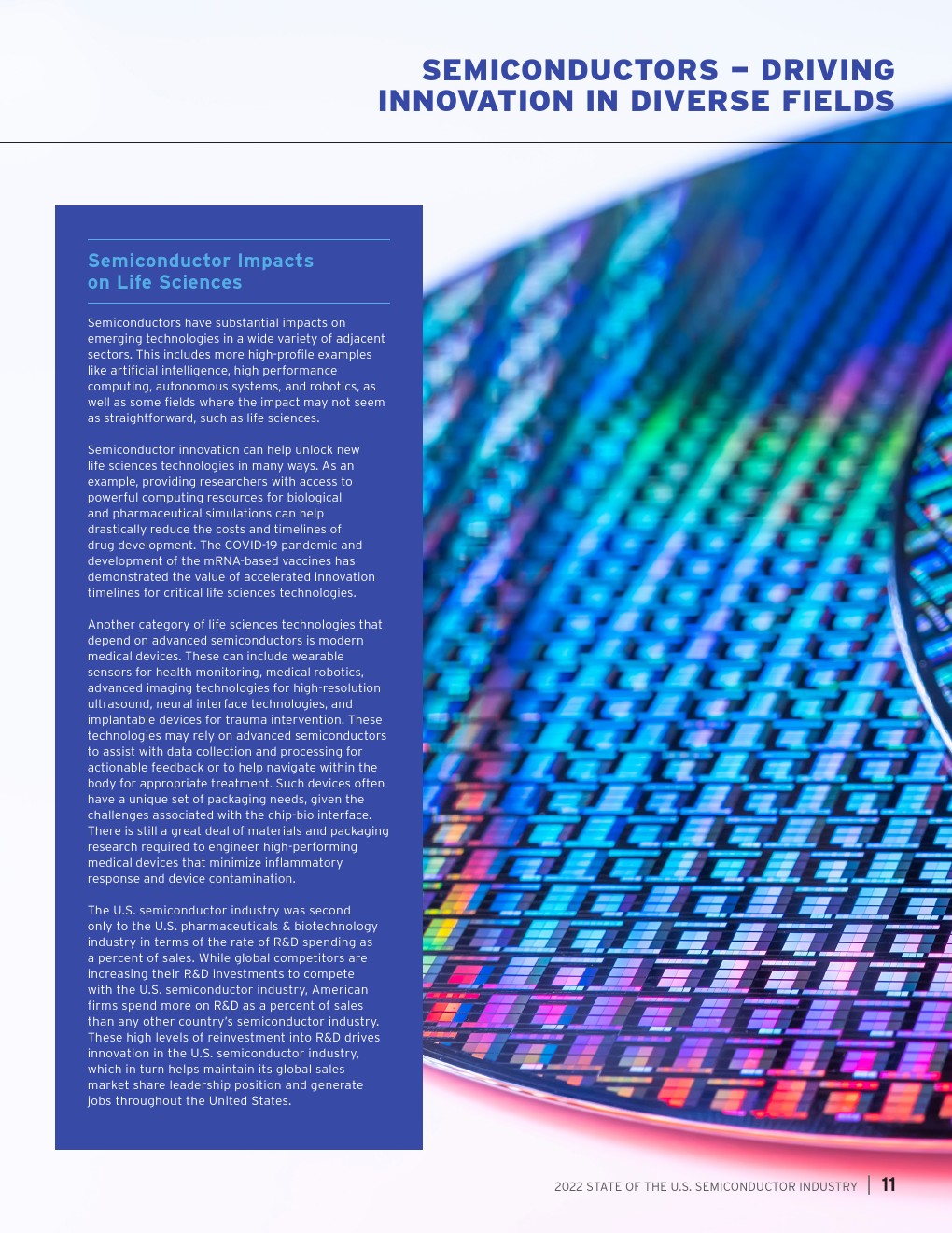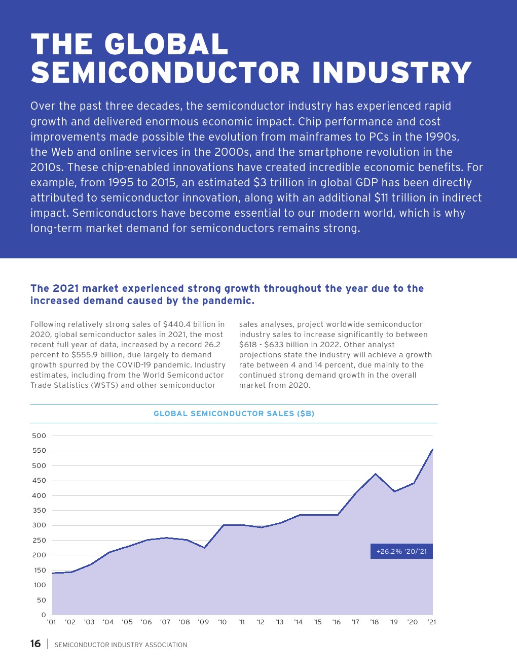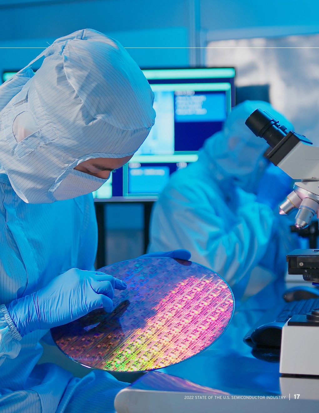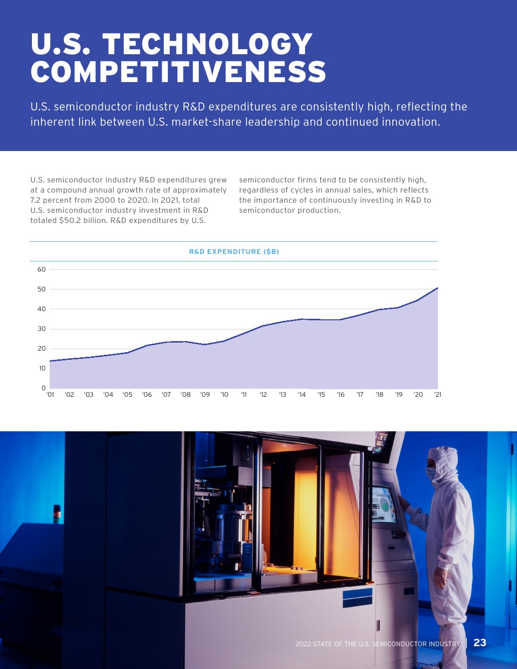 事实上,2022年全球各行业的半导体出货量比历史上任何一年都多,这一成就有助于缓解持续的全球芯片短缺。与此同时,美国半导体公司继续将年收入的大约1/5用于研发,2021 年达到创纪录的 502 亿美元。这推动了芯片的进步,以及其他行业的发展。