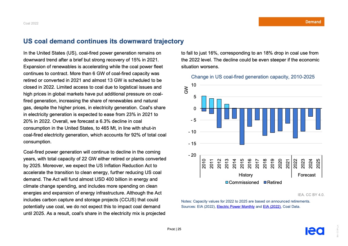 报告预计,今年全球燃煤发电量将上升到约10.3兆瓦时,而煤炭产量预计将增加5.4%至约83亿吨,为历史最高水平。同时,煤炭产量将在2023年达到峰值,但到2025年应降至2022年水平以下。