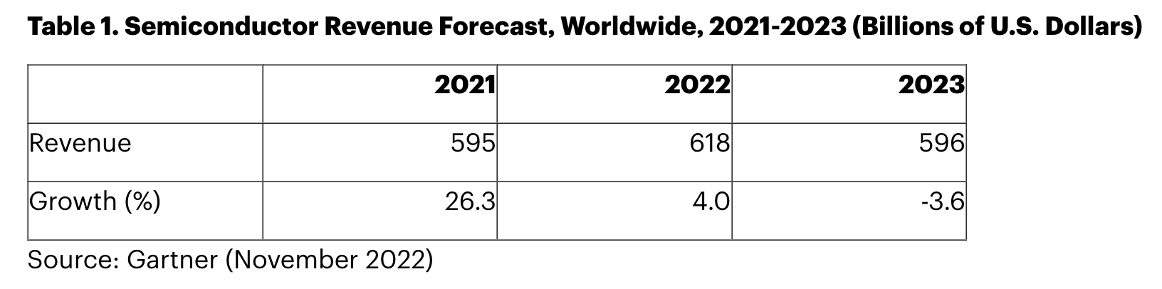 根据 Gartner 的最新预测,2023 年全球半导体收入预计将下降 3.6%。该市场 2022 年的总收入将达到 6180 亿美元,增长 4%。Gartner 研究业务副总裁 Richard Gordon 表示:“半导体行业的短期收入前景不容乐观。全球经济的迅速恶化和消费者需求的减弱将在 2023 年对半导体市场产生负面影响。”