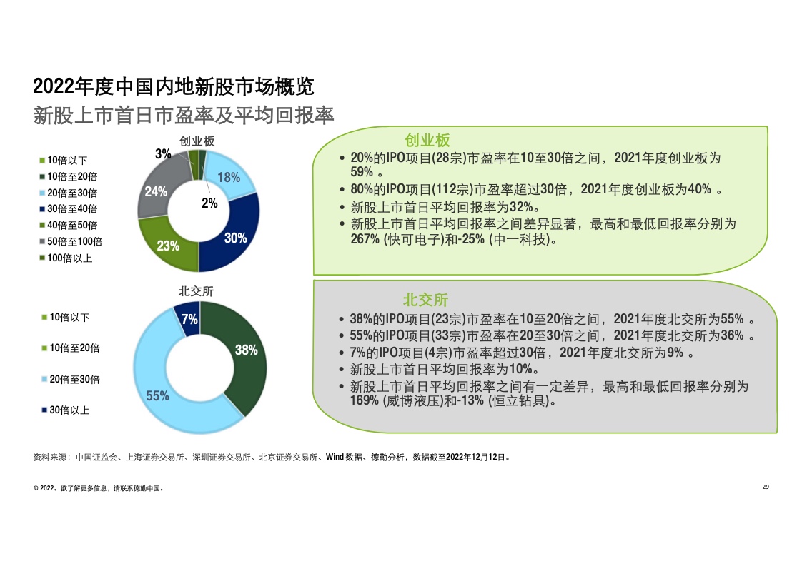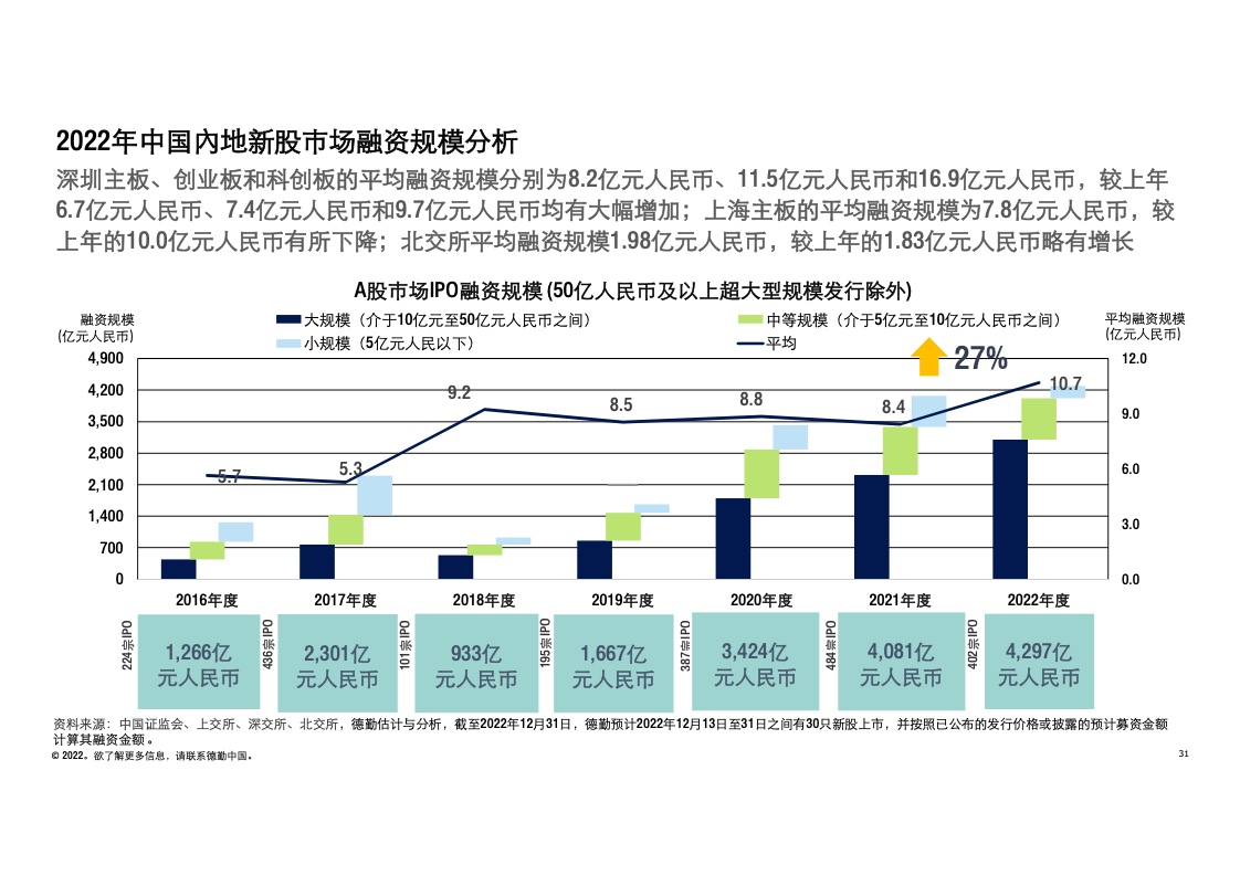 2022年,中国内地市场受惠于持续深化资本市场改革,例如于大部分市场推出新股发行注册制和建立一个多层次的资本市场,因此尽管面对经济的挑战,仍然能够在2022年以新股融资总额刷下新的纪录。而两只超大型红筹新股回流上市也为造就此佳绩作出贡献。