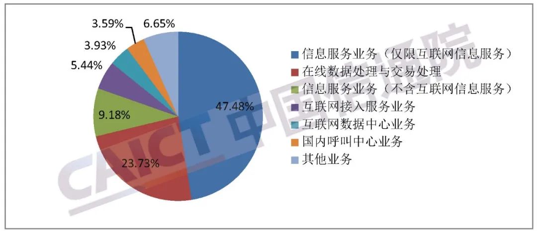 按照2015版《电信业务分类目录》中增值电信业务分类,141494家增值电信企业合计拥有202652个许可项目。其中,96217个信息服务业务(仅限互联网信息服务),48097个在线数据处理与交易处理业务,18597个信息服务业务(不含互联网信息服务),11024个互联网接入服务业务,7969个互联网数据中心业务,7269个国内呼叫中心业务,其他业务13479个。