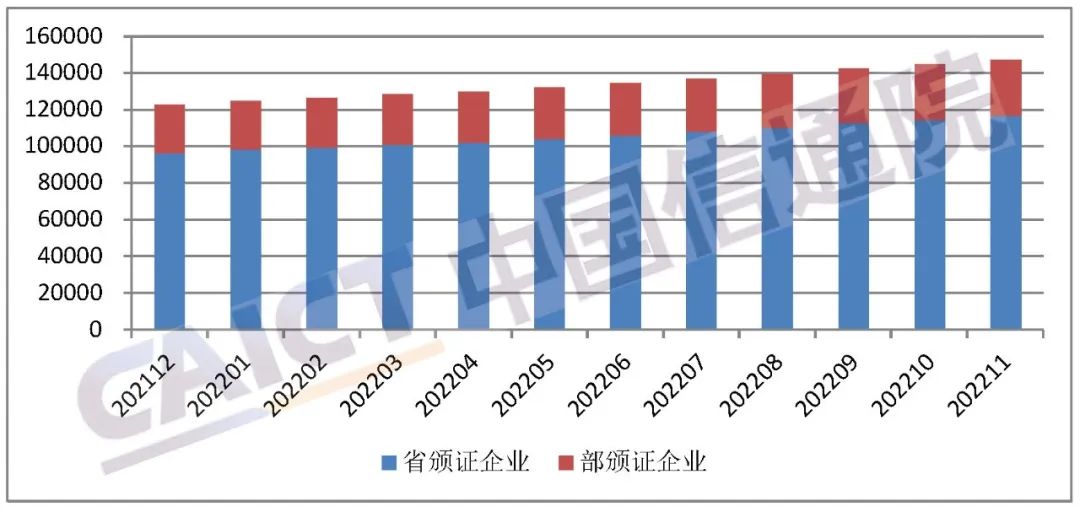 截至2022年11月底,全国增值电信业务经营许可企业共141494家(其中5919家企业同时持有工业和信息化部及省通信管理局颁发的增值电信业务经营许可),比上月增长1.76%,其中工业和信息化部许可的跨地区企业30505家,各省(区、市)通信管理局许可的本地企业合计116908家,分别比上月增长0.72%和1.95%。