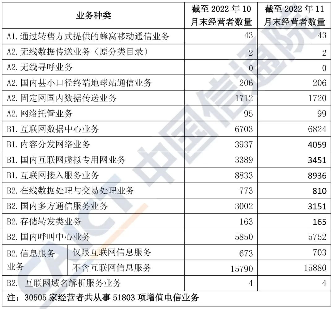 表1 截至2022年11月末跨地区各类增值电信业务经营者数量