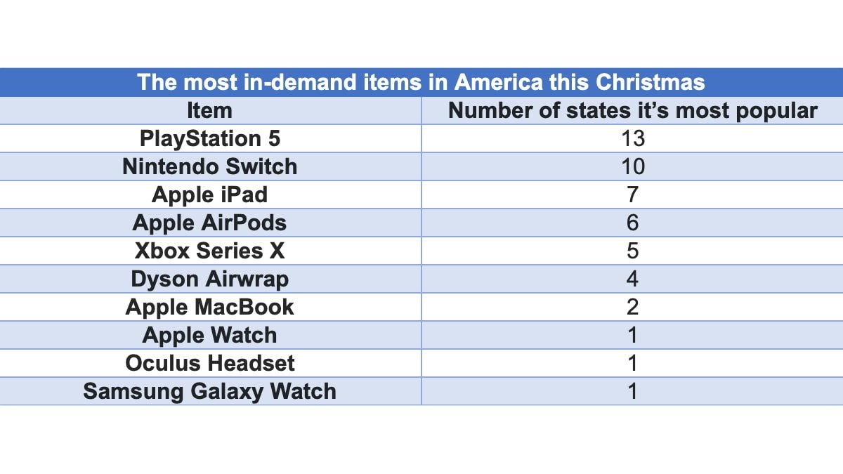 乐天的研究人员也考察了其他公司的产品。加利福尼亚州的大多数居民想要一台Playstation 5,在每种产品最受欢迎的州的数量上击败了iPad。