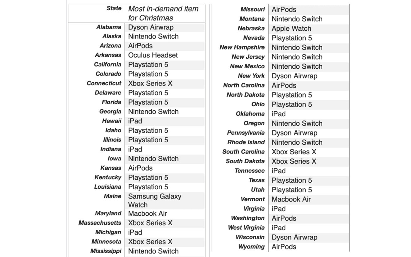 AirPods是全美需求量第四大的商品。有六个州对这种耳塞的搜索量超过了其他任何物品,包括堪萨斯州、怀俄明州、北卡罗来纳州和亚利桑那州。