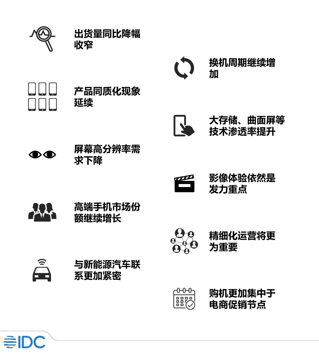 疫情影响持续,经济环境和消费者信心需要更长时间恢复。上半年库存压力依然存在。预计2023年中国手机市场出货量同比下降0.9%,降幅收窄;2024年有望迎来反弹。