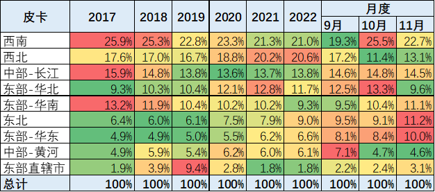 皮卡市场的区域在西北、西南为主,西部地区的皮卡需求较大。11月西北地区的皮卡需求剧烈下降仅占全国份额的13%,较正常水平下降近7个百分点。