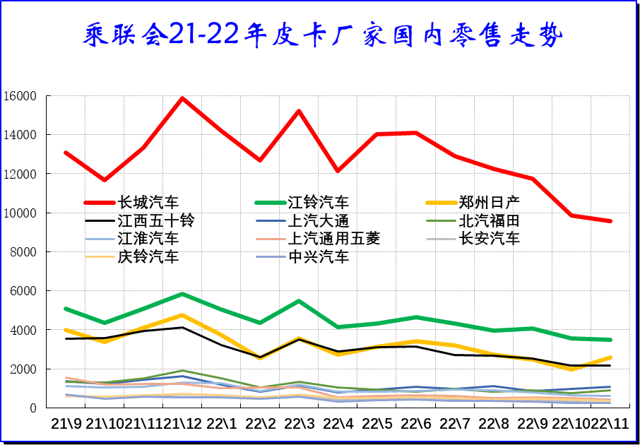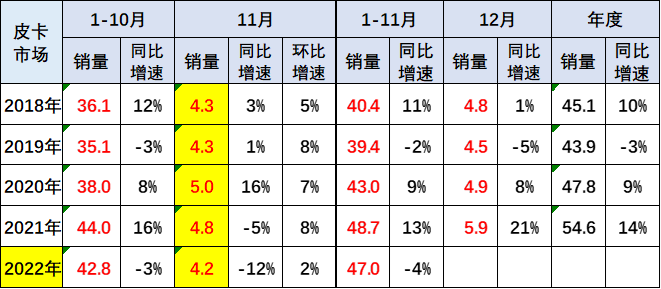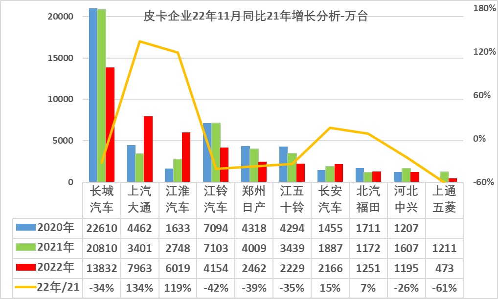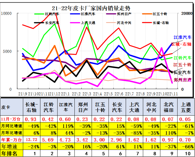 今年1-11月的总体皮卡走势相对较平稳,达到47万辆,较2021年1-11月下降4%,相对于卡车的同比剧烈下降,皮卡产销表现还是很好的。