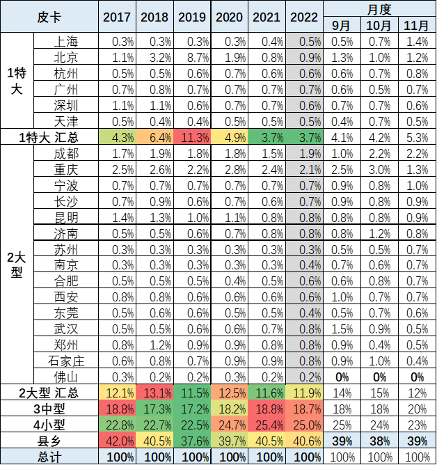 皮卡市场目前主力的销售区域还是在以中小城市和县乡市场为主,尤其是县乡市场目前的表现相对来说还是较强。2022年11月的中小城市市场表现尤其突出的特征。而县乡城市市场保持稳定,大城市市场目前来看市场并没有明显的突破的特征。