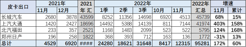 今年以长城为代表的的皮卡出口超强,全国1-11月累计出口皮卡95,281辆,增速50%。11月的皮卡出口达到12,315辆,同比增长172%。长城汽车和上汽大通、福田等企业出口表现优秀。