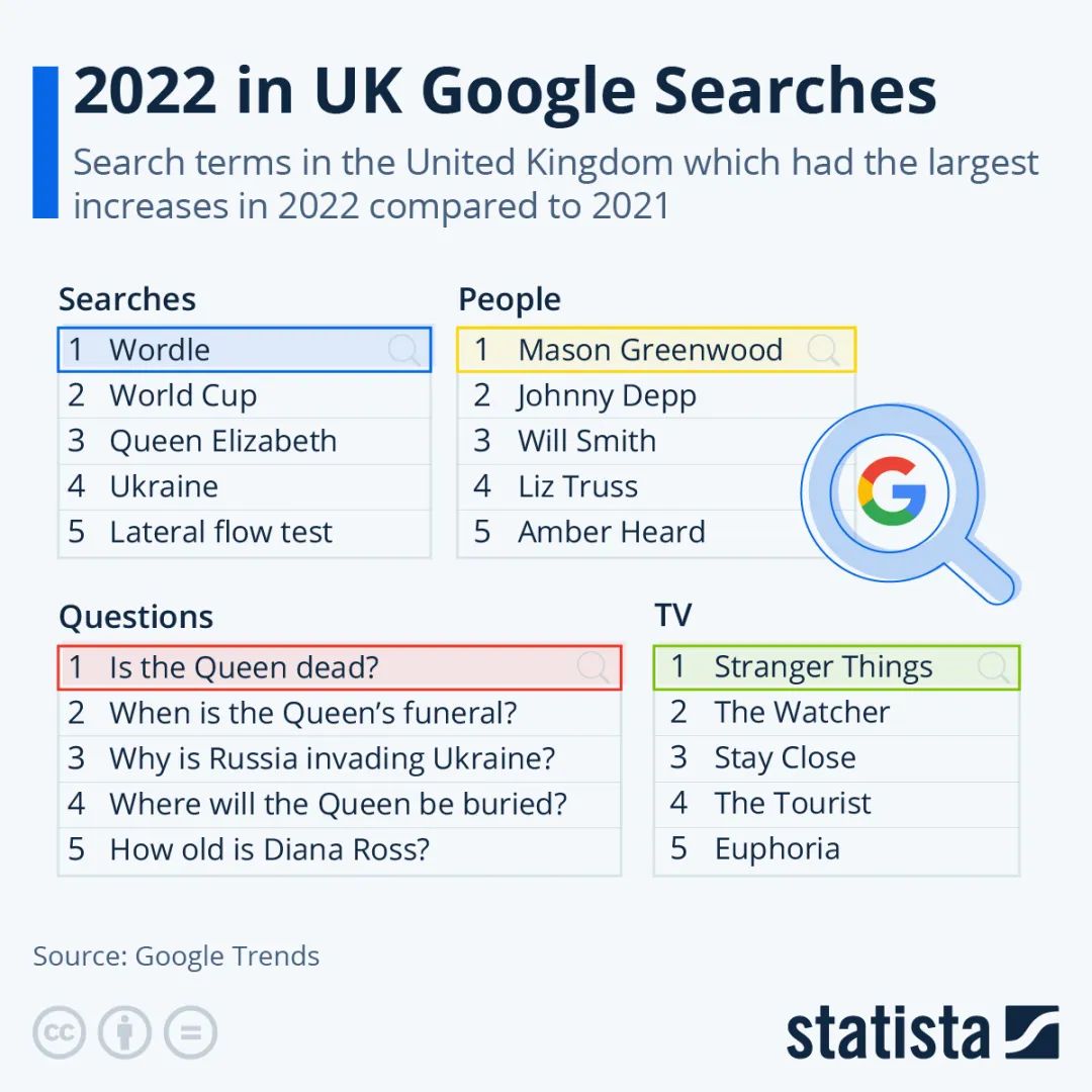 每年,谷歌都会公布过去12个月里最大的热门搜索查询。2021年,“新冠疫苗”和“封锁”是英国最热门的话题之一,而2022年则出现了一系列全新的问题。诸如“女王死了吗?”和“俄罗斯为什么要入侵乌克兰”等问题描绘了这一年中人们所经历的一些主要担忧。