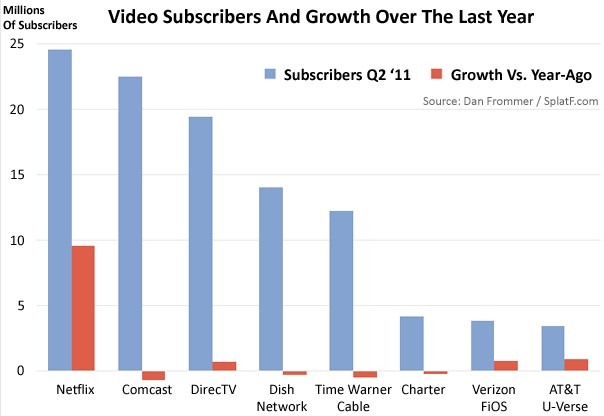 2011.9.3日,美国主流网站和流媒体服务以及付费电视的用户数据情况,数据图表,其中流媒体服务 Netflix 雄踞老大,总用户 2500万左右,去年一年增加100万左右。