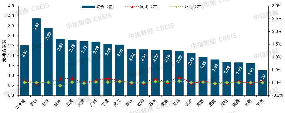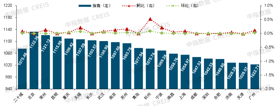 2022年12月,二十城物业服务价格综合指数为1075.48,同比上涨0.08%,涨幅较去年同期收窄0.30个百分点;环比上涨0.01%,涨幅较上期收窄0.05个百分点。同比来看,二十城中,杭州、宁波、无锡等12个城市物业服务价格指数上涨,上涨城市数量较去年同期减少7个;北京、长沙、合肥等7个城市物业服务价格指数与去年同期持平;仅天津物业服务价格指数同比下跌。其中杭州同比上涨0.52%,涨幅较去年同期收窄0.93个百分点;宁波、无锡等6个城市涨幅在0.1%-0.3%之间;上海、武汉等5个城市同比涨幅均在0.1%以内,其中济南、重庆、南昌涨幅相对较小,均为0.04%;而天津为同比唯一下跌城市,跌幅0.01%。与2022年6月相比,杭州、无锡、苏州等8个城市物业服务价格指数上涨,上涨城市数量较上期减少4个;北京、常州、南昌等9个城市环比持平;上海、济南、天津环比下跌。其中,杭州、无锡环比分别上涨0.08%和0.07%,涨幅较上期分别收窄0.36个百分点和0.07个百分点;苏州、武汉、重庆等6个城市涨幅均在0.05%以内,其中宁波、南京涨幅相对较小,均为0.01%;而天津环比跌幅相对较大,为0.03%,济南、上海环比跌幅均为0.01%。
