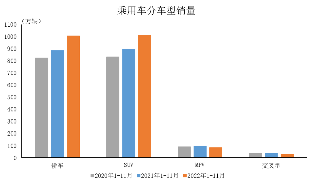 2022年1-11月,在乘用车主要品种中,与上年同期相比,基本型乘用车(轿车)和运动型多用途乘用车(SUV)产销依然呈现较快增长,带动乘用车整体继续保持两位数增速;其他两大类车型呈现不同程度下降。
