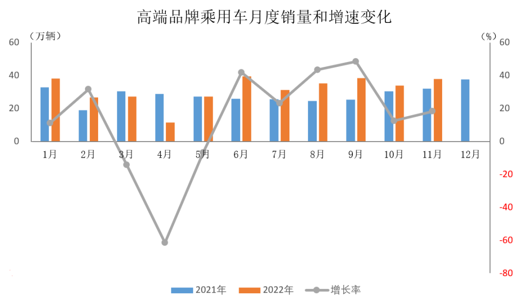 2022年11月,国内生产的高端品牌乘用车销量完成38万辆,同比增长18.2%。同比增速超过乘用车市场23.8个百分点。