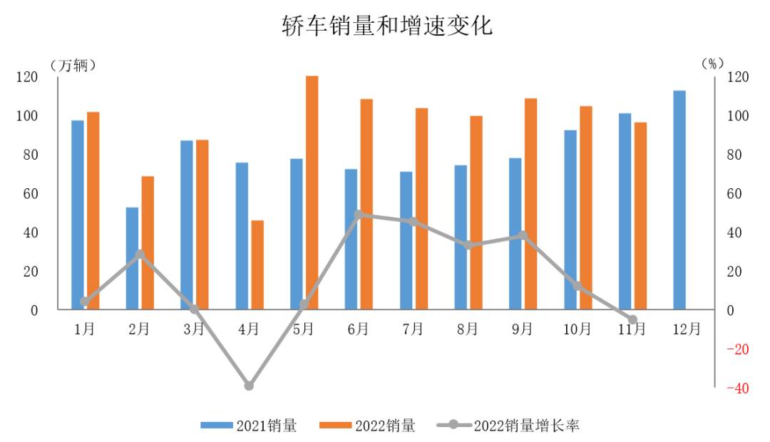 2022年1-11月,乘用车产销分别完成2170.2万辆和2129.2万辆,同比分别增长14.8%和11.5%。
