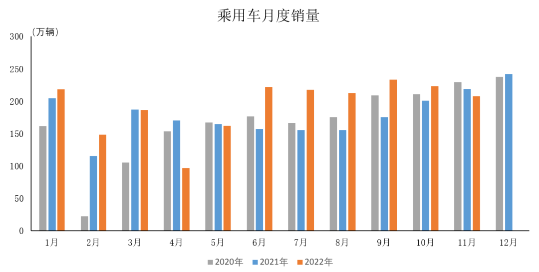 2022年11月,乘用车产销分别完成215.1万辆和207.5万辆,环比分别下降7.9%和7%,同比分别下降3.9%和5.6%。