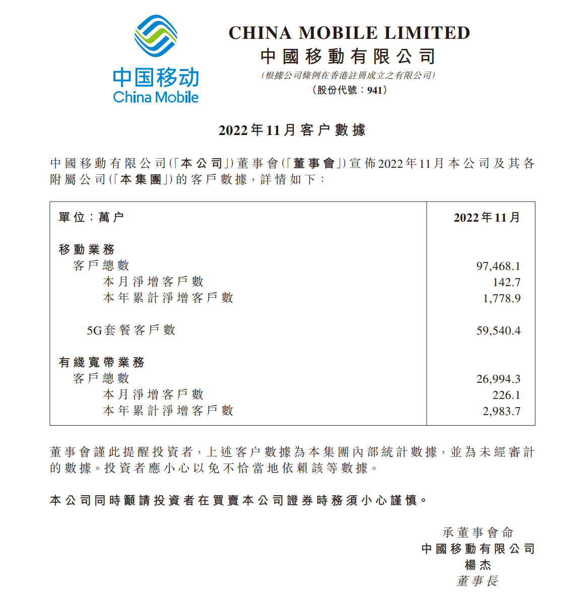 中国移动今日发布了 2022 年 11 月客户数据公告,移动业务客户总数达 9.75 亿户,11 月增加 142.7 万户,本年累计增长 1778.9 万户。此外,11 月 5G 套餐客户累计达 5.95 亿户。中国移动 11 月有线宽带业务方面,客户总数累计到达 26,994.3 万户,本月净增数 226.1 万户。