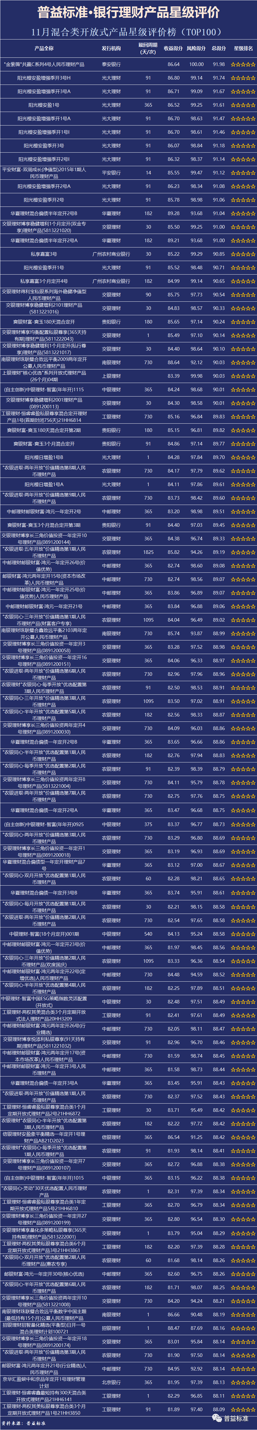 11月,固收类封闭式理财产品表现星级评价榜中,上海浦东发展银行发行的悦盈利专享2106期综合排名第一;固收类开放式理财产品表现星级评价榜中,招银理财发行的招银理财招睿青葵系列两年定开13号固定收益类理财计划301068C排名第一;混合类封闭式理财产品表现星级评价榜中,工银理财发行的工银理财·恒睿睿鑫混合类封闭式理财产品(21HH6194)排名第一;混合类开放式理财产品表现星级评价榜中,泰安银行发行的”金紫薇”共赢C系列4号人民币理财产品排名第一。