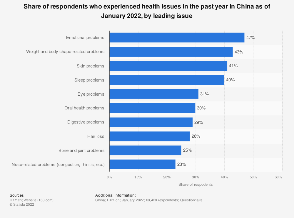 根据2022年1月在中国进行的一项调查,情绪问题仍然是中国公民的主要健康问题,约47%的受访者表示他们在过去一年中经历过情绪问题。除此之外,身材和皮肤相关的问题也困扰着超过40%的受访者。