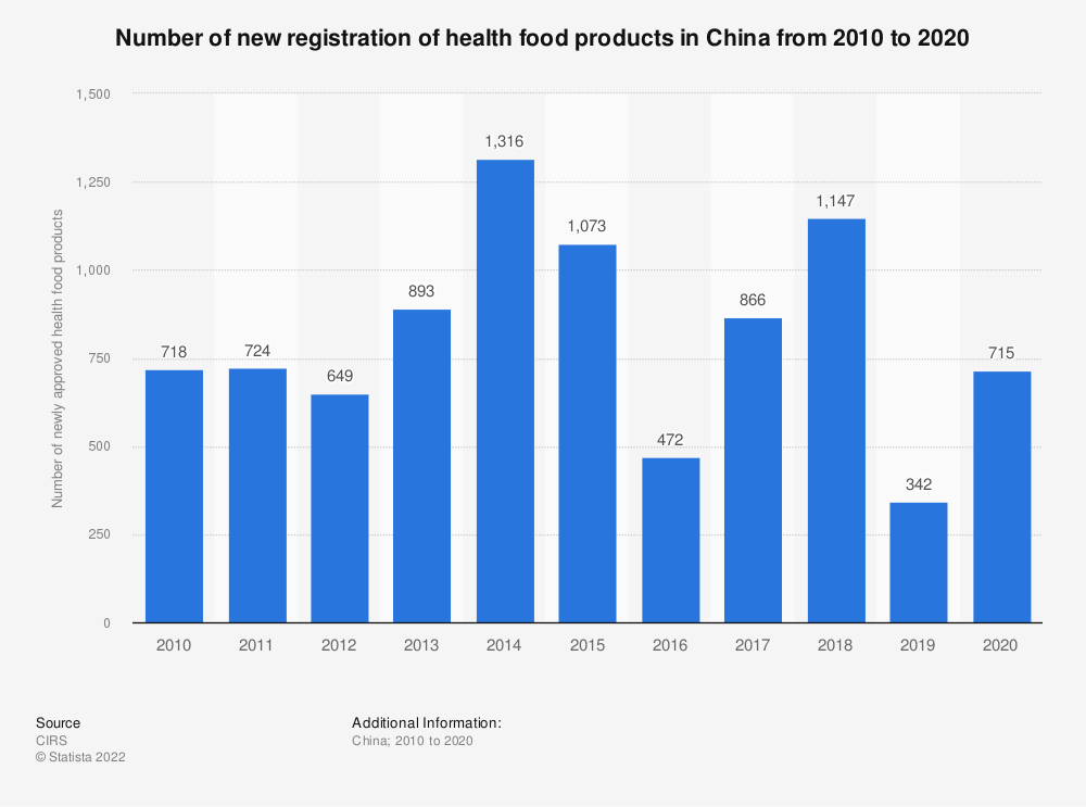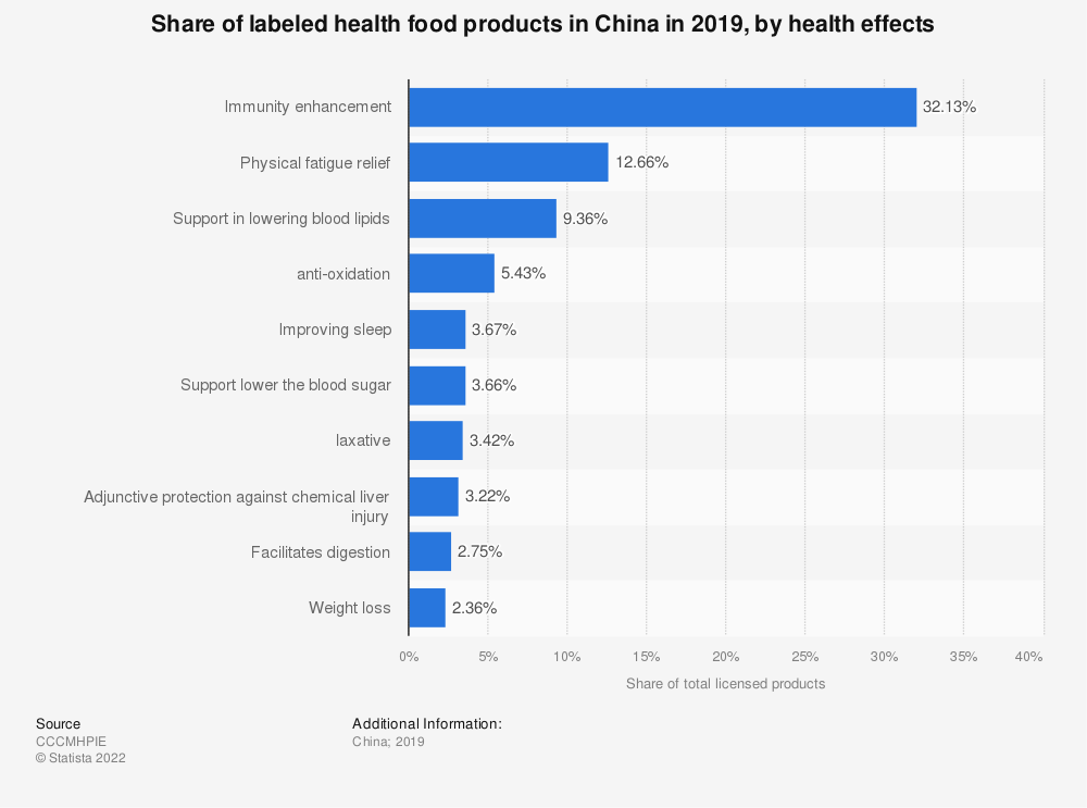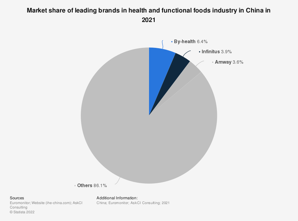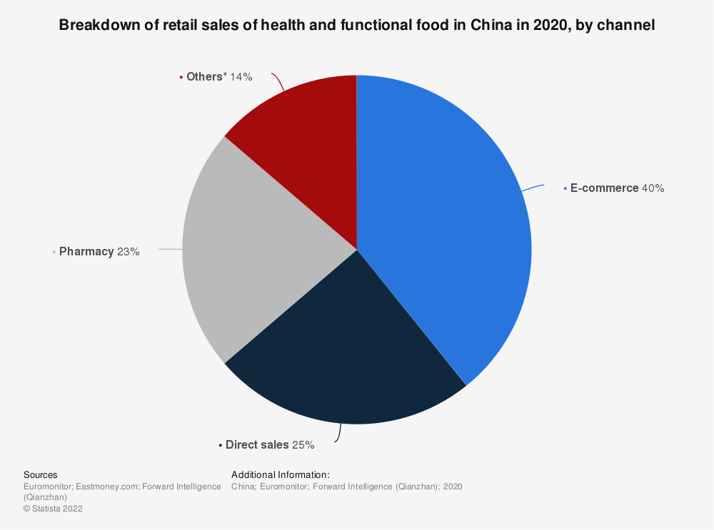 现代强化功能性食品在中国已经出现了近半个世纪。然而,直到21世纪初,市场才受到监管。2005年,中国官方首次将功能食品(或保健食品)定义为具有特定保健功能或提供维生素和/或矿物质的产品。2020年,约有715种保健食品在中国正式注册。在中国被批准的保健食品中,最常见的健康声明是增强免疫系统和缓解疲劳。2019年,中国大部分功能食品都是通过直销销售的,即销售人员从母公司购买产品,然后销售给客户。在中国五大功能性食品市场领导者中,有三家(安利、无限极、完美)采用了直销模式。然而,雪球式零售系统在中国受到严格的监管,以防止欺诈。另一方面,中国领先的功能性食品和膳食补充剂制造商汤臣倍健的大部分收入来自电商平台。