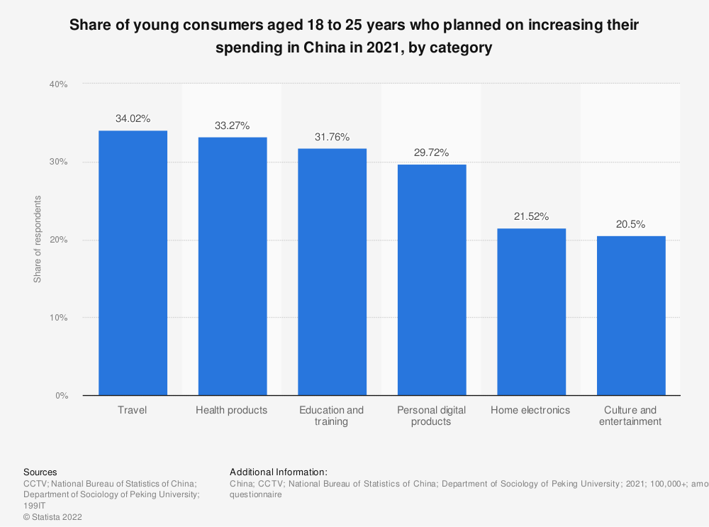 根据这项于2021年对中国10多万名受访者进行的调查,在18岁至25岁的年轻受访者中,约34%的人表示他们计划今年在旅游上花更多钱。相比之下,约30%的受访者希望增加在手机和笔记本电脑等数字产品上的支出。因此,食用功能性食品已成为中国年轻工人提高健康和免疫力的流行策略。在所有功能食品中,由天然成分制成的产品,如水果、蔬菜提取物或中药,受到许多中国年轻消费者的青睐。