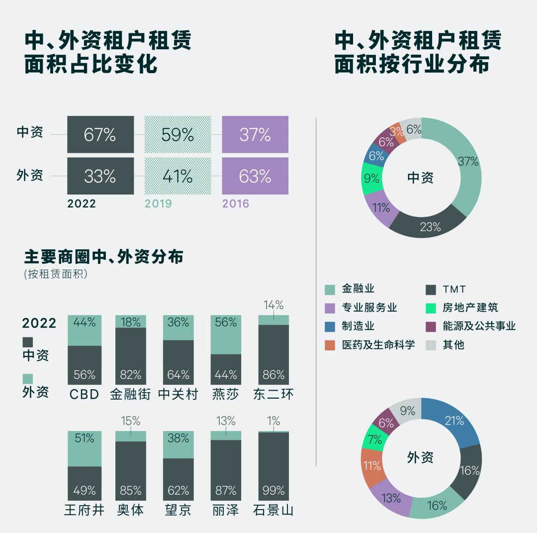 中资金融、TMT、专业服务等行业企业近年在京不断扩张,且对办公品质的要求不断提升,逐步成为北京甲级写字楼租赁需求的中流砥柱,其中中资租户在金融街、东二环、奥体和各新兴商务区更是占有绝对优势。