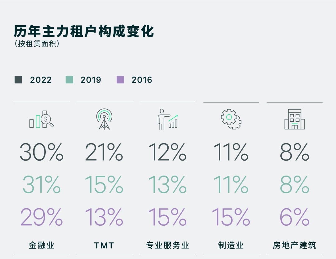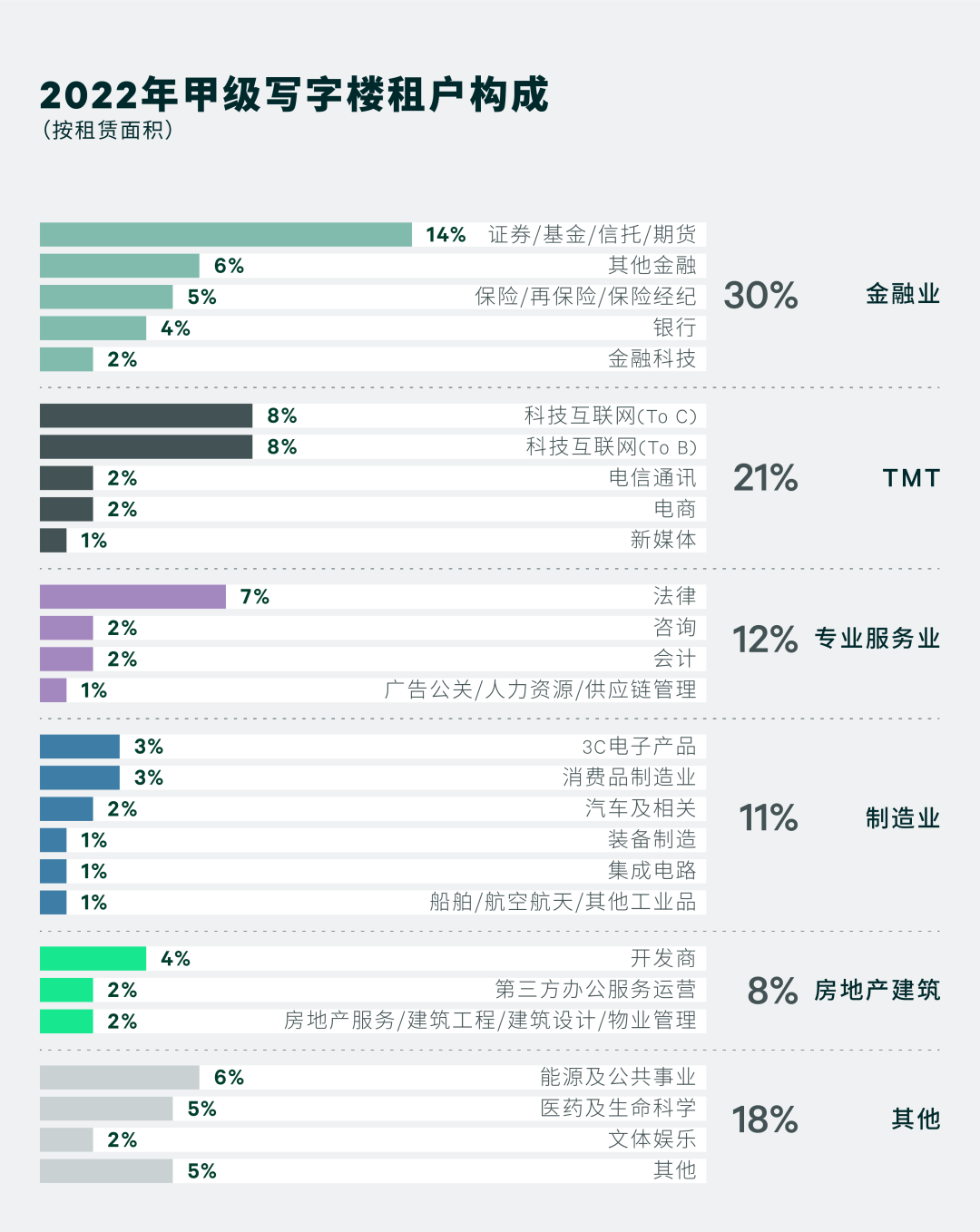 过去三年,非银行金融和科技互联网两大领域的创新发展是北京办公需求的“双引擎”,使得金融业和TMT合计租赁面积占比三年间提升4.2个百分点至50.8%。从2022年租赁成交看,金融业中的证券、基金和TMT中的软件开发、人工智能、大数据等赛道保持活跃,而高精尖制造业、升级型传统制造业、以及医药及生命科学等产业类租户则逆势布局。