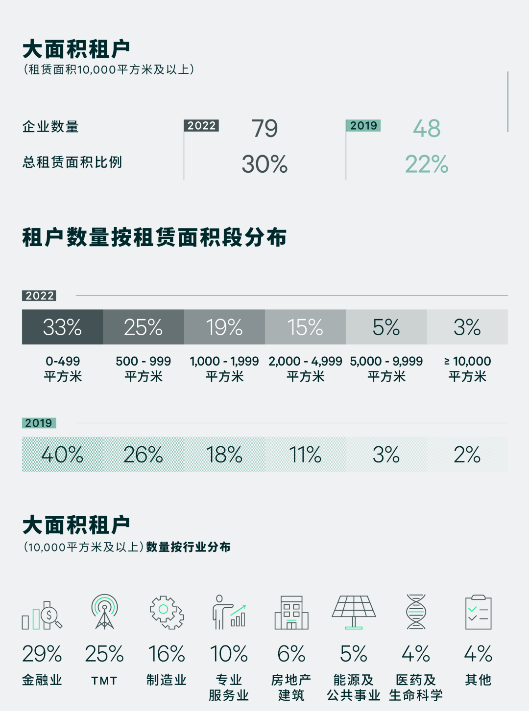 过去三年,进入“万平级”俱乐部的甲级写字楼租户数量从48上升至79,总租赁面积占比从22%上升至30%,这一方面要归功于金融、TMT和专业服务等行业头部中资企业的发展壮大,另一方面受益于过去三年的供应潮,各类大型企业获得更多扩大、腾挪、整合办公空间的机会。