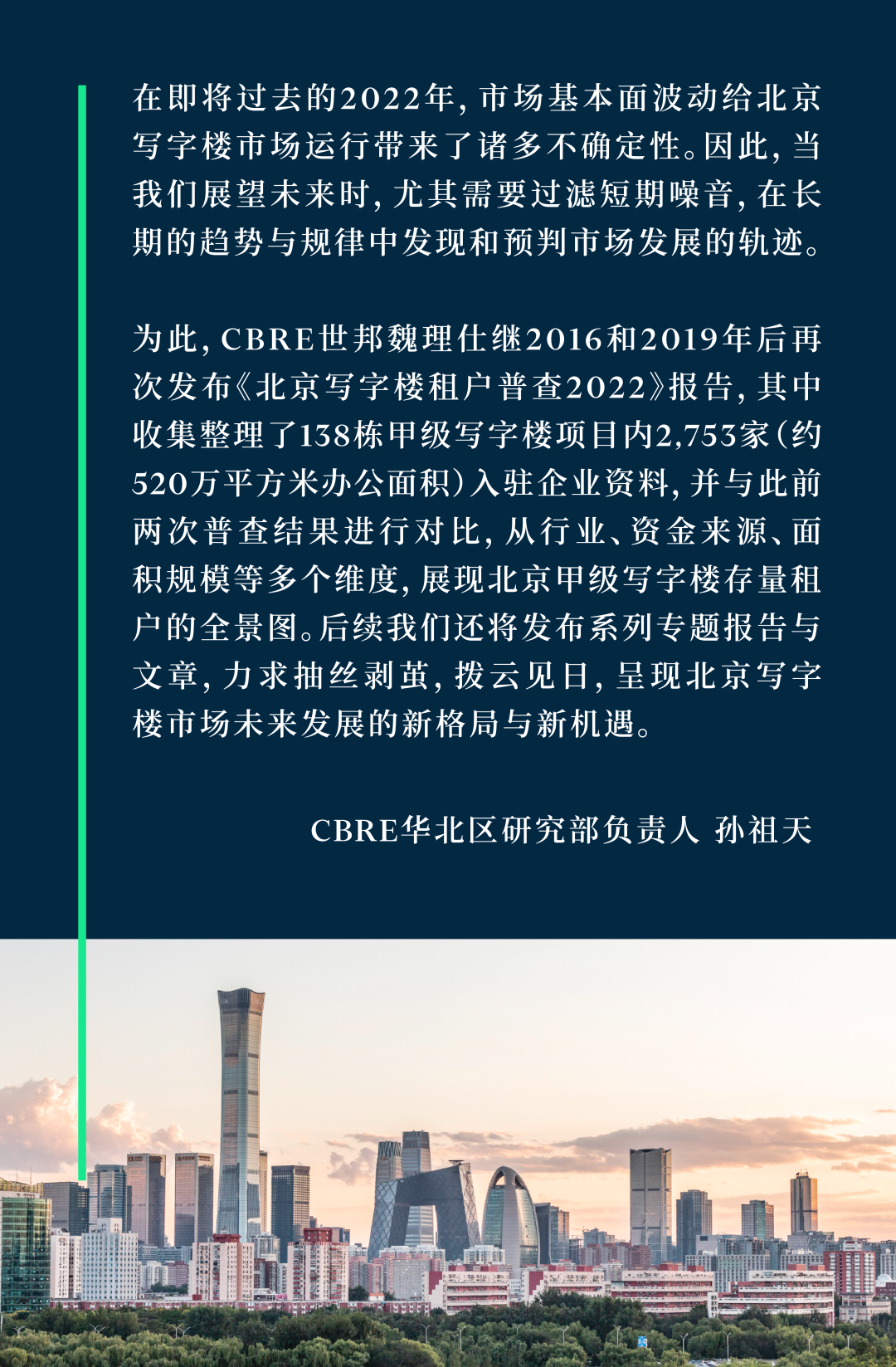 本次报告跨越疫情影响下市场风云变幻的三年,展现了三年间北京写字楼的租户变迁。近期全国防疫政策不断优化,为北京办公需求回暖带来重大利好。随着各行各业复工复产,租赁、装修等活动将重回正轨,市场重拾信心,潜在需求将得以释放。作为首都和重要的门户城市,北京写字楼租赁市场和国内其他城市相比有鲜明的特色,我们将一如既往地为客户识别和预判市场机会。在不断演变的市场环境中寻求最优的解决方案,是我们对客户不变的承诺。