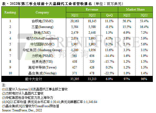 据TrendForce集邦咨询研究,受惠于iPhone新机备货需求带动苹果系供应链拉货动能,推升第三季前十大晶圆代工业者产值达到352.1亿美元,环比增长6%。但无奈全球总体经济表现疲弱、高通胀及疫情持续冲击消费市场信心,导致下半年旺季不旺,延迟库存去化,使得客户对晶圆代工业者订单修正幅度加深,预期第四季营收将因此下跌,正式结束过去两年晶圆代工产业逐季成长的盛况。