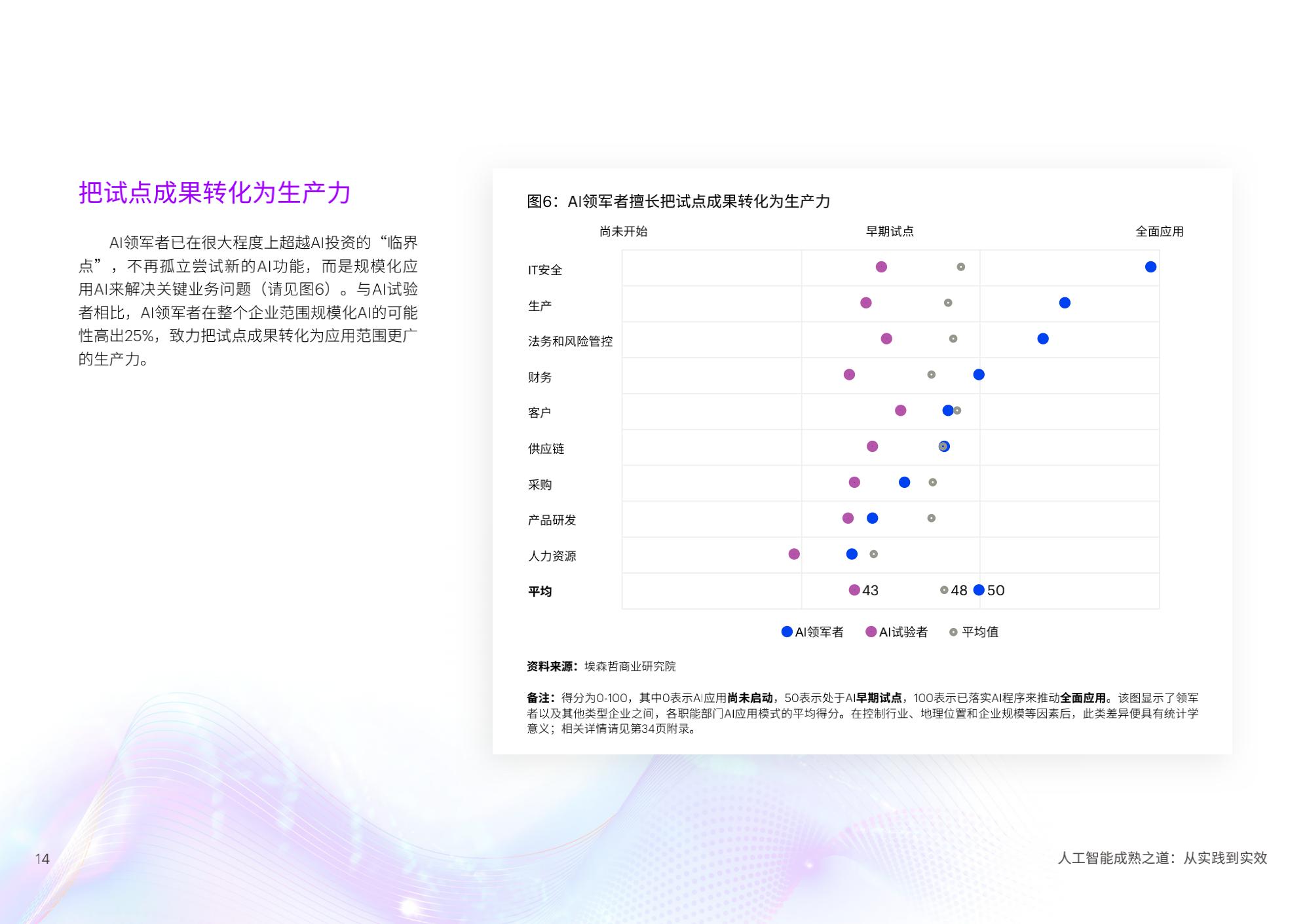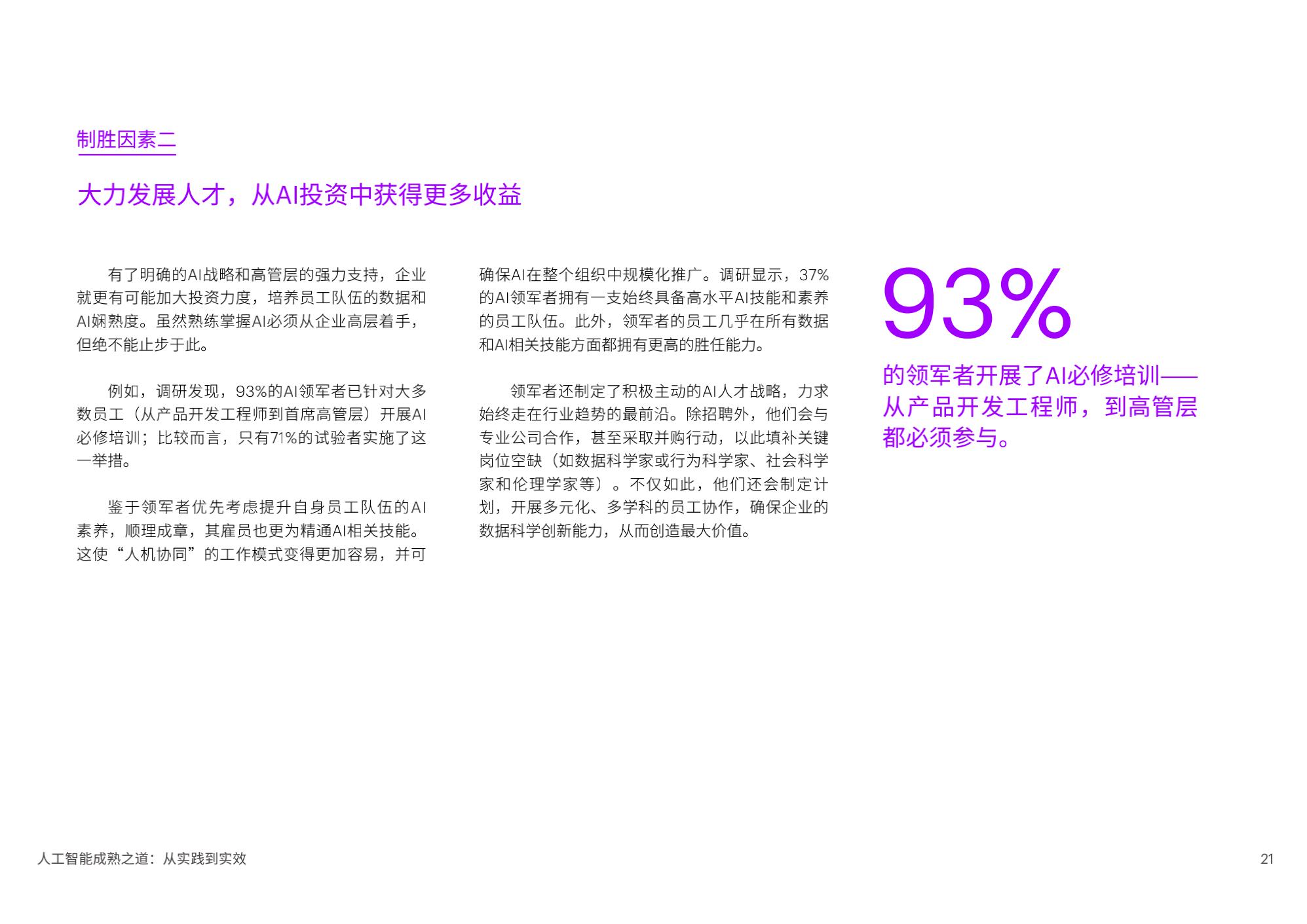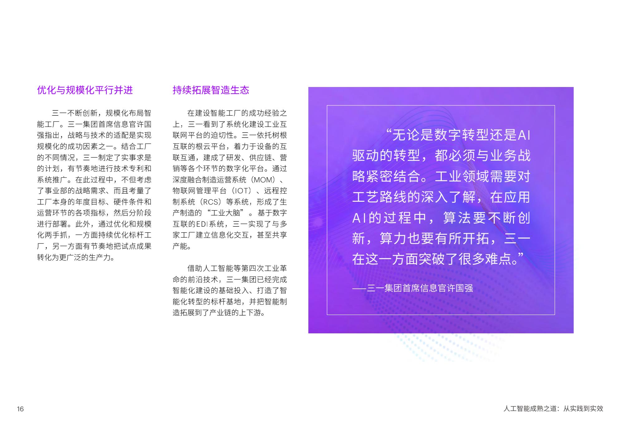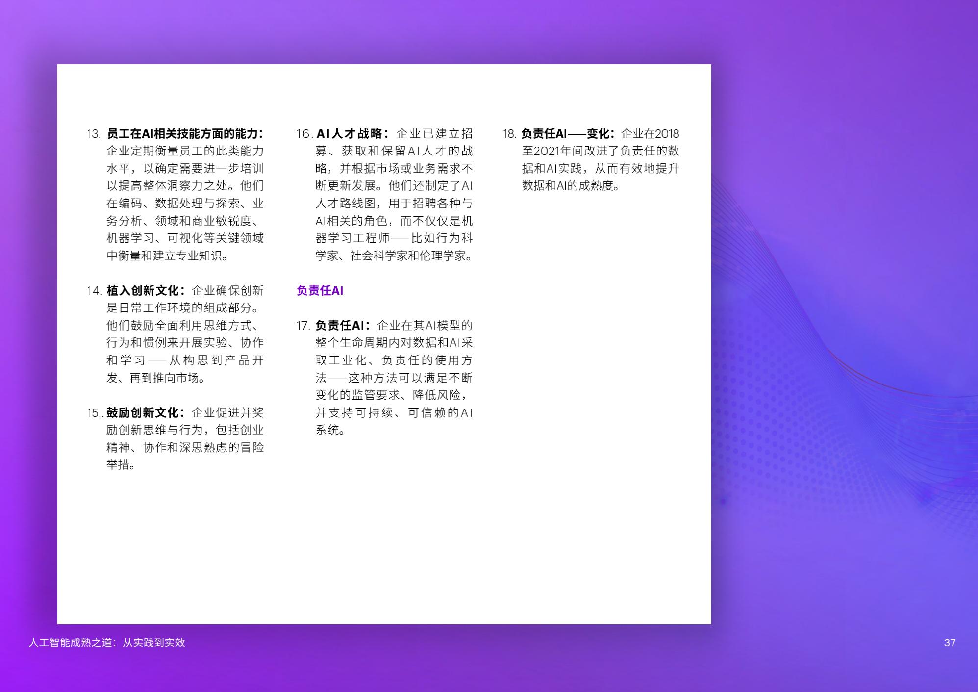 陈泽奇补充道:“对于企业来说,规模化应用AI是一门技术课题,也是一门管理学问。在加速提升成熟度的过程中,企业管理者需要考虑短期和长期投入,将AI更好地融入企业整体战略重点,以人才为基石,打造AI核心能力,一以贯之地坚持包容和可持续,方能发挥AI开创、启发和引领的实际作用。”