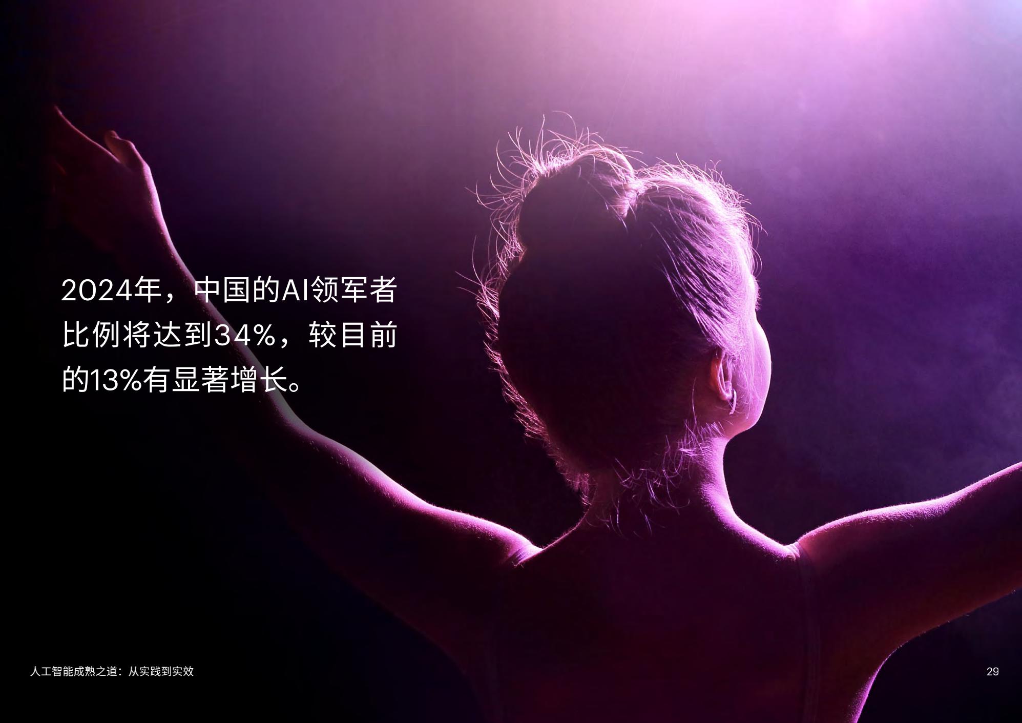 这项评估基于对250家中国企业的调研。评估结果发现,13%的中国受访企业展现出较高的AI成熟度水平,成为应用AI领军者,其成熟度平均得分为64,是其他企业的一倍多。同时,领军企业的营收增速也较其他企业高出了50%。超过半数(52%)的受访企业依旧处于应用AI试验阶段,有待深入挖掘AI价值潜能。通过机器模型预测,埃森哲认为,到2024年AI领军者的比例将达到34%。