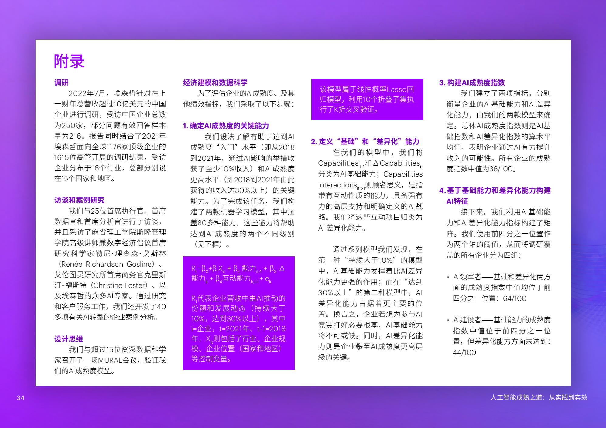2022年7月到9月,埃森哲对来自17个行业的250家中国企业开展调研,这些受访企业在上一财年的总营收均超过70亿人民币。在此基础上,本次研究利用机器学习解读调研数据集,力求揭示企业应用AI的驱动因素。同时,本此研究结合了2021年埃森哲面向全球1,176家企业的1,615位高管的调研结果。有关研究的详细说明,请参阅研究报告附录。