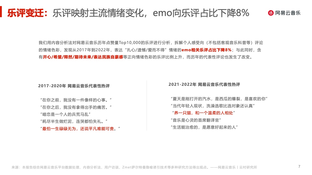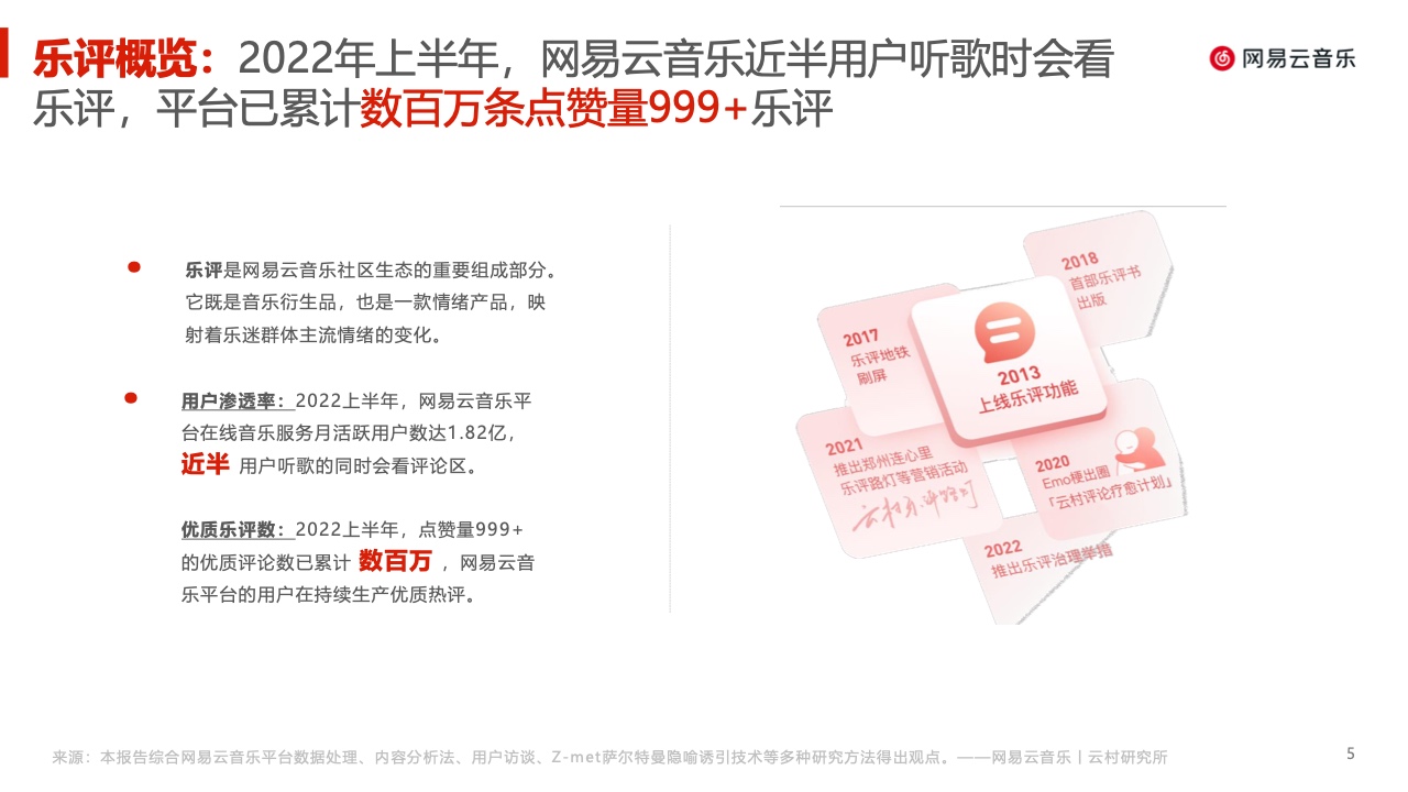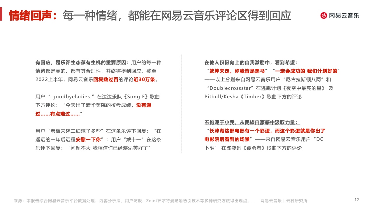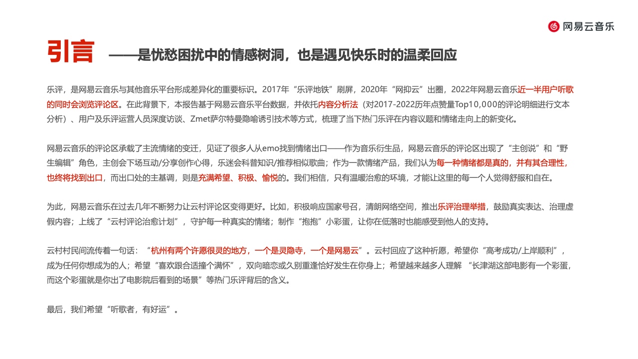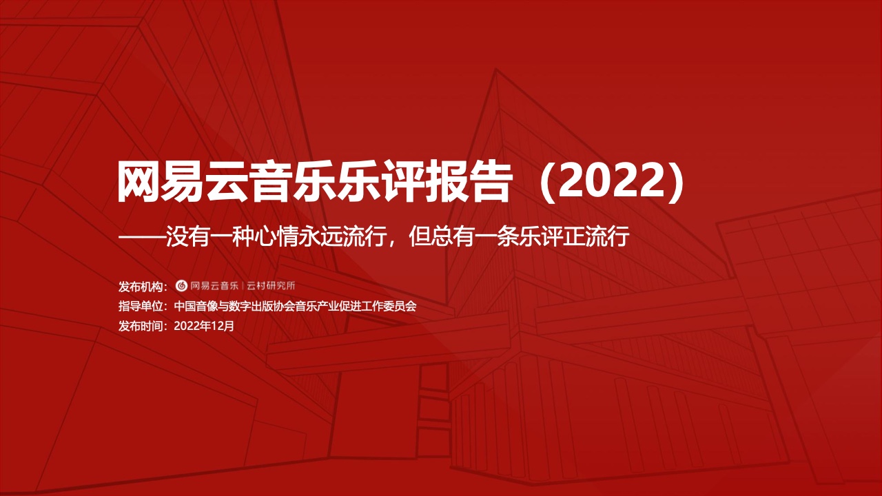 2022年网易云音乐乐评报告 更多阅读:网易云音乐财报:2022年网易云音乐营收90亿元 同比增长28.5%腾讯音乐财报:2022年腾讯音乐调整后净利润47.5亿元 同比增长14.4%Midia Research:截至2022年上半年末全球流媒体音乐付费用户量已达到6.162 亿数字音频的收入增长中,主要靠这个市场……腾讯音乐娱乐财报:2024年Q3腾讯音乐娱乐集团总收入达70.2亿元 同比增长6.8%美国唱片业协会:2021年付费音乐流媒体订阅量达到8400万 同比增长11%RIAA:2022年上半年美国录制音乐产业共创造76.9 亿美元的收入规模Omdia:预计到2024年底全球音乐零售市场销售额将达439亿美元CMA:Spotify占据了英国约60%的音乐流媒体市场 亚马逊持有高达30%的市场份额网易云音乐财报:2022年上半年网易云音乐净收入达到42.6亿元 同比增长达33.8%预计周杰伦新专辑销售额已超1.5亿元QQ音乐:周杰伦占据QQ音乐飙升榜前50 《最伟大的作品》先行MV不到半个小时全网播放量突破千万周杰伦专辑《最伟大的作品》先行曲MV发布 20分钟点击超千万腾讯音乐财报:2023年Q1腾讯音乐净利润为11.5亿元人民币 同比增长 88.5%苹果:2022年10月Apple Music曲库的曲目数量已经突破了1亿大关