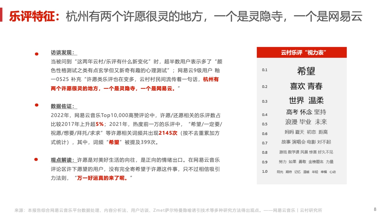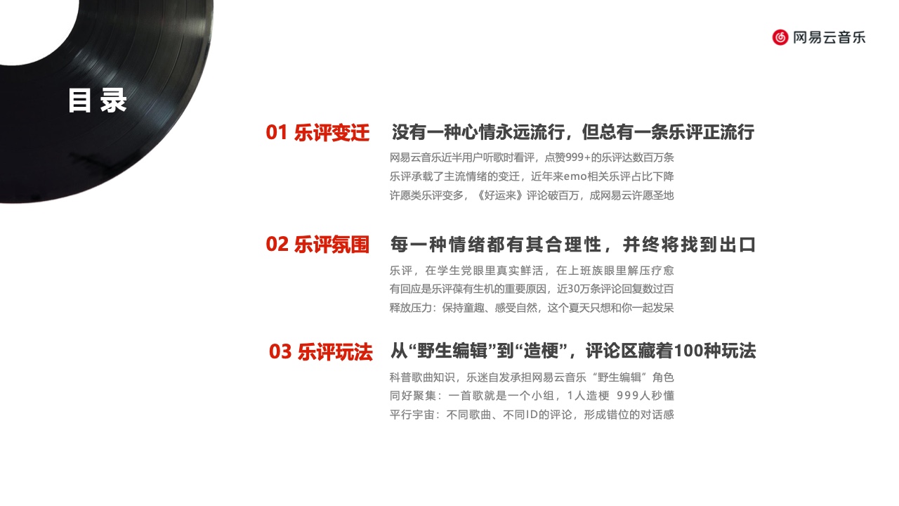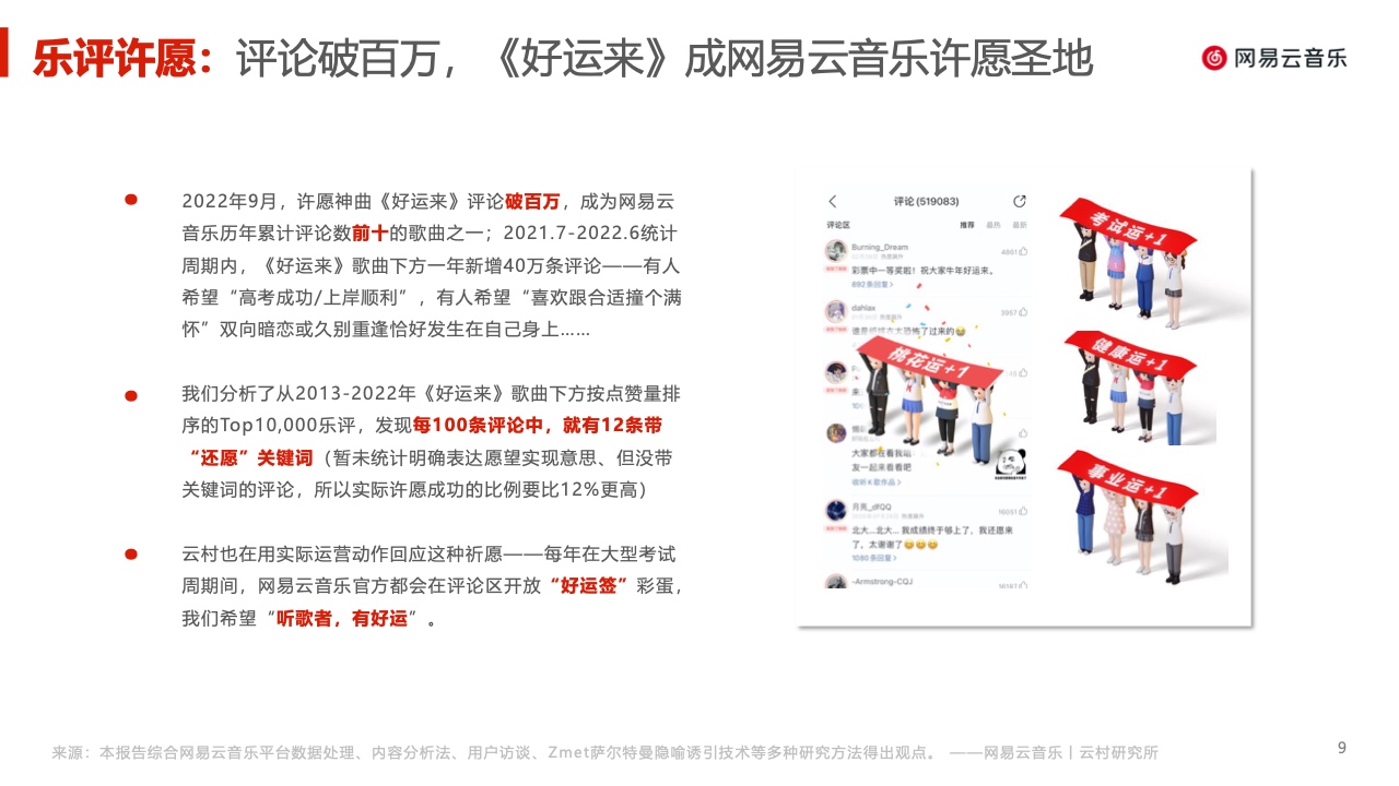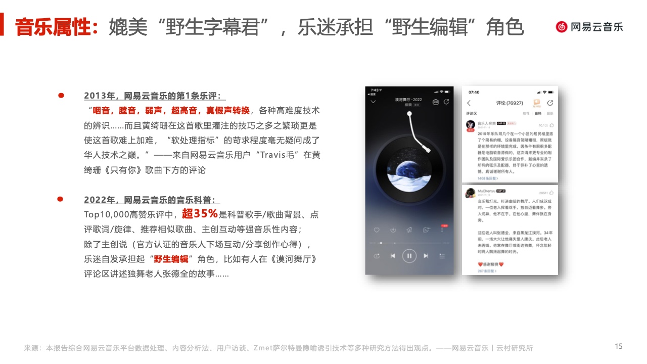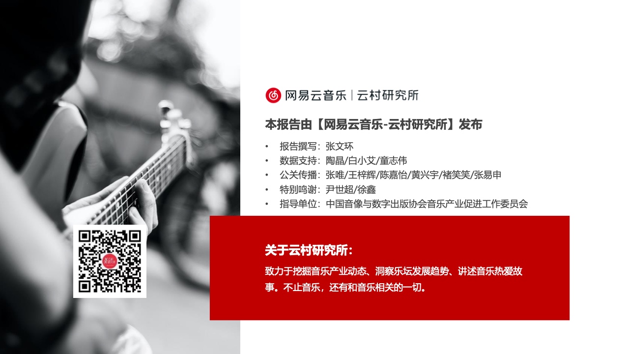 2022年网易云音乐乐评报告 更多阅读:网易云音乐财报:2022年网易云音乐营收90亿元 同比增长28.5%腾讯音乐财报:2022年腾讯音乐调整后净利润47.5亿元 同比增长14.4%Midia Research:截至2022年上半年末全球流媒体音乐付费用户量已达到6.162 亿数字音频的收入增长中,主要靠这个市场……腾讯音乐娱乐财报:2024年Q3腾讯音乐娱乐集团总收入达70.2亿元 同比增长6.8%美国唱片业协会:2021年付费音乐流媒体订阅量达到8400万 同比增长11%RIAA:2022年上半年美国录制音乐产业共创造76.9 亿美元的收入规模Omdia:预计到2024年底全球音乐零售市场销售额将达439亿美元CMA:Spotify占据了英国约60%的音乐流媒体市场 亚马逊持有高达30%的市场份额网易云音乐财报:2022年上半年网易云音乐净收入达到42.6亿元 同比增长达33.8%预计周杰伦新专辑销售额已超1.5亿元QQ音乐:周杰伦占据QQ音乐飙升榜前50 《最伟大的作品》先行MV不到半个小时全网播放量突破千万周杰伦专辑《最伟大的作品》先行曲MV发布 20分钟点击超千万腾讯音乐财报:2023年Q1腾讯音乐净利润为11.5亿元人民币 同比增长 88.5%苹果:2022年10月Apple Music曲库的曲目数量已经突破了1亿大关