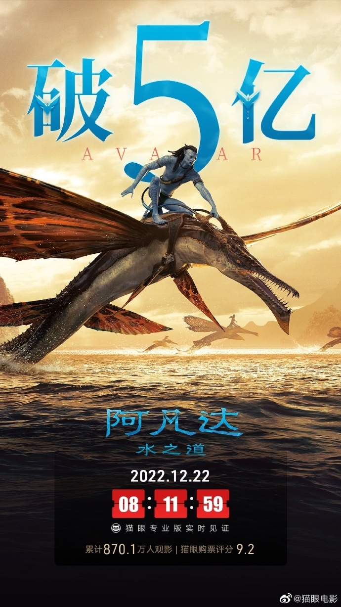 作为当前国内最热的电影,《阿凡达2:水之道》吸引了很多人去看,上映7天来票房也突破了5亿大关。据猫眼电影数据,截至12月22日8点11分,《阿凡达2:水之道》总票房突破5亿元,正好也是上映第七天,累计已有870.1万人观看。
