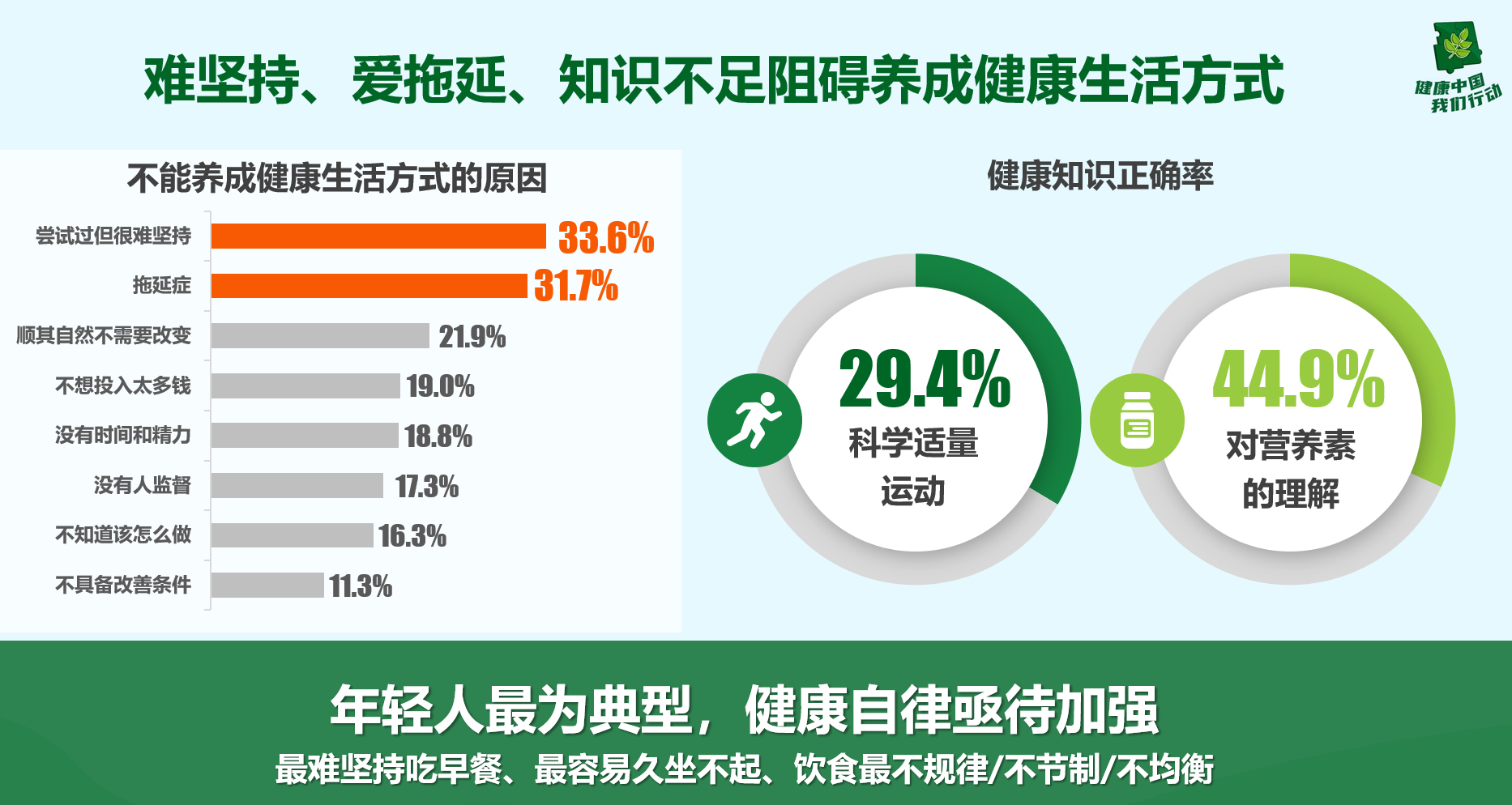 合理膳食、适量运动、戒烟限酒、心理平衡的健康生活方式,知易行难。刘胜兰介绍,阻碍健康生活方式原因多样,调查发现“难坚持”及“拖延症”占比最高,分别为33.6%和31.7%。同时,国民健康知识也明显不足,其中科学适量运动和营养素理解两项,正确率分别仅为29.4%和44.9%。