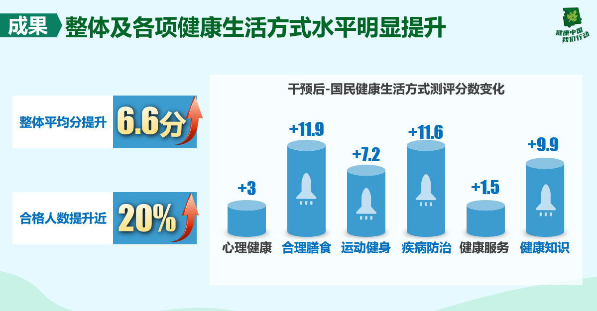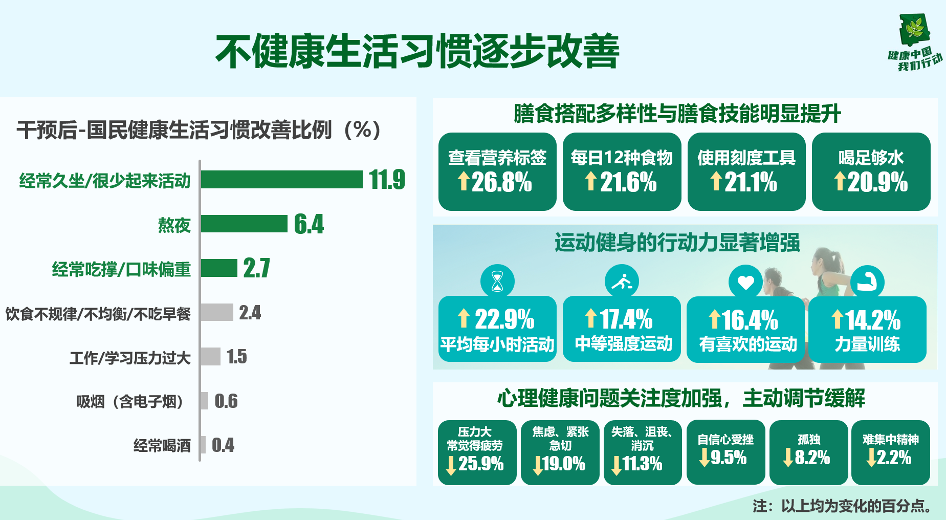 基于线上组队、线下行动的“组团健康”,参与者在健康生活方式的六个维度上有显著改善。对比干预前后(学习前后)的测评分数,合理膳食、疾病防治、健康知识、运动健身方面的得分,分别提高11.9分、11.6分、9.9分、7.2分;参与者膳食搭配多样性与膳食技能明显提升,运动健身行动力显著增强;心理健康问题关注度加强。