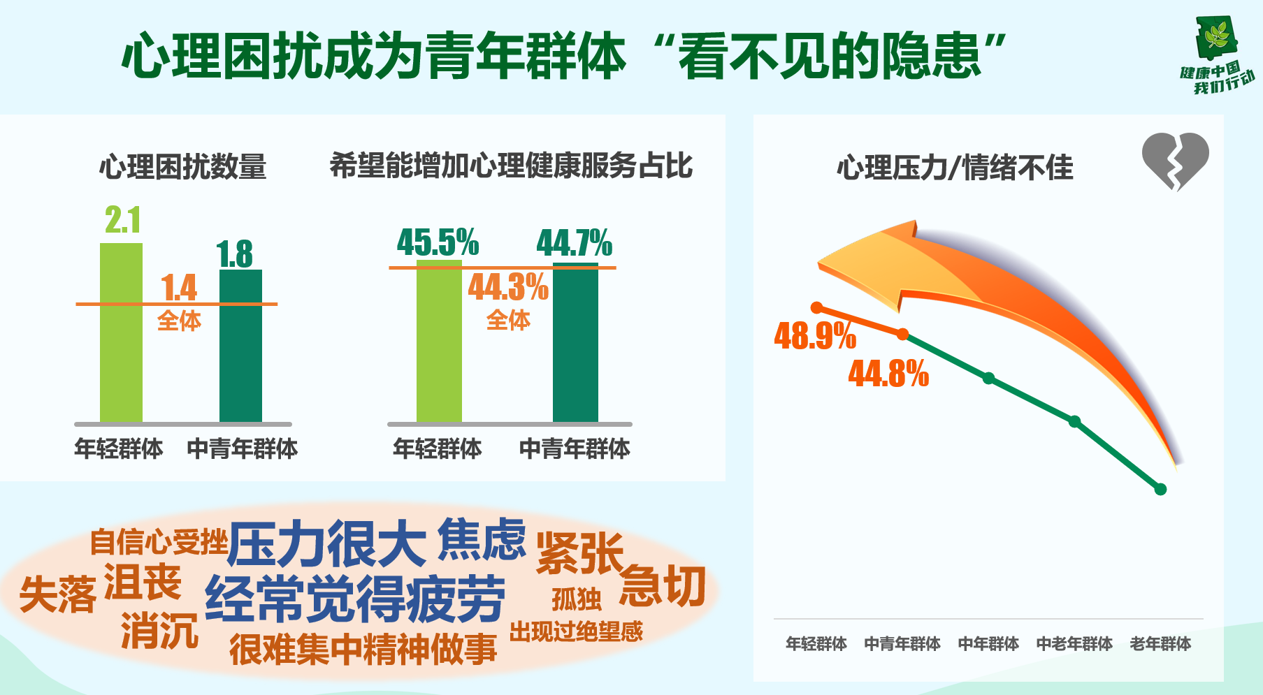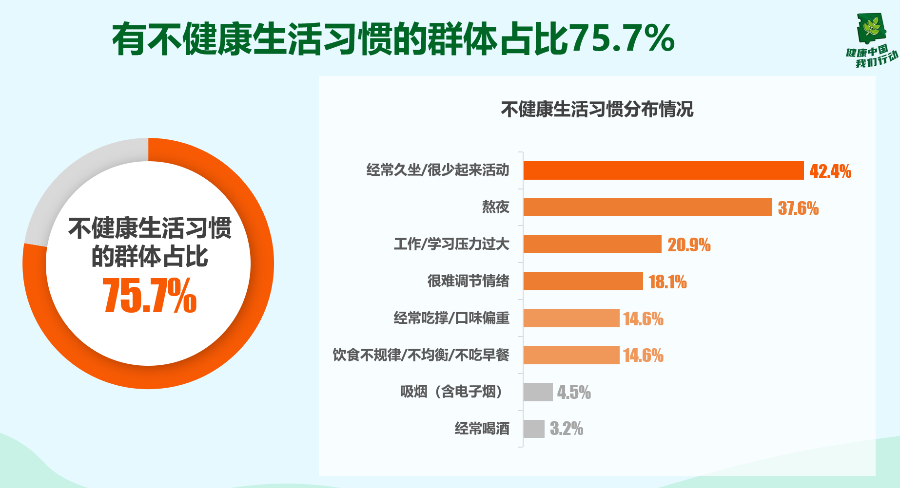 报告显示,虽然全民健康意识和健康自评情况良好,但健康生活方式情况却远未令人满意。合理膳食种类不够(每天摄入12种食物的人群只有21.4%)、缺乏运动(每周150分钟中等强度运动)成为两大短板,而甫入社会打拼的年轻群体,健康生活方式得分最低。