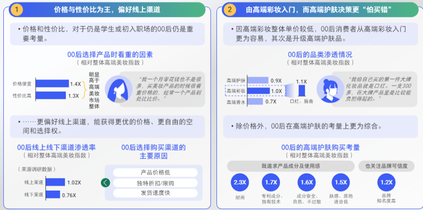 这样的消费画像也决定,00后在决策时,“成本”是一个很大的原则:00后更爱线上比价,对溢价水平稍低的高端彩妆更有负担能力,更愿意尝试有趣、有创意的美妆产品,挑选高端护肤时更强调的是“耐用”(2.3x),其次才是“专利”(1.7x)&“成分”(1.6x)。