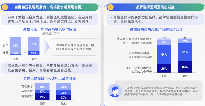 与女性相比,年龄在36岁以上的男性比例更大,因为他们入手的高端产品往往是香水,有自用需求的同时可以送礼,所以他们不但可以持续升级产品(自用悦己),也更注重产品的功能性、广告宣传、包装体验(送礼有面子),男性对品牌的忠诚度也会更高。