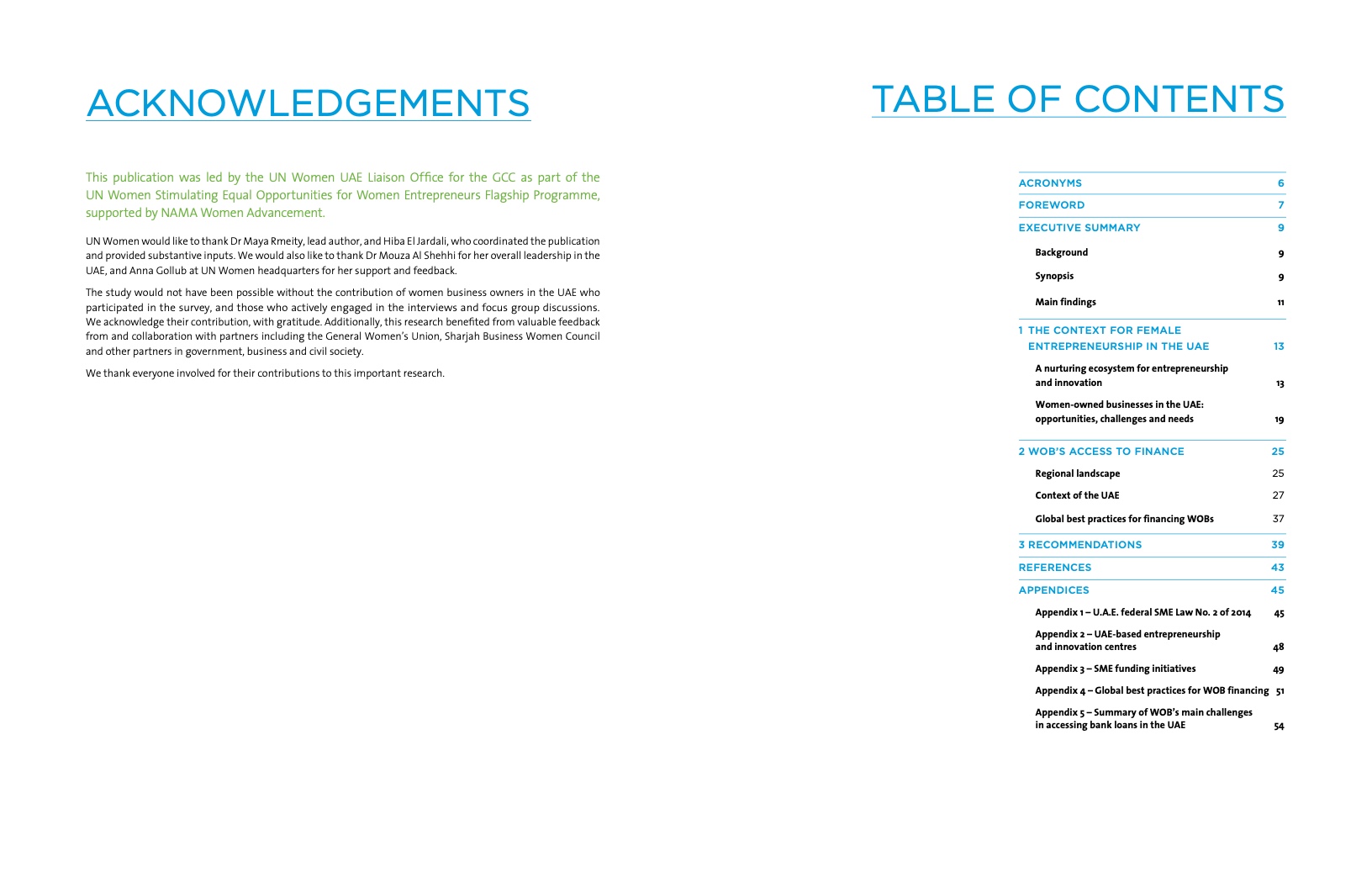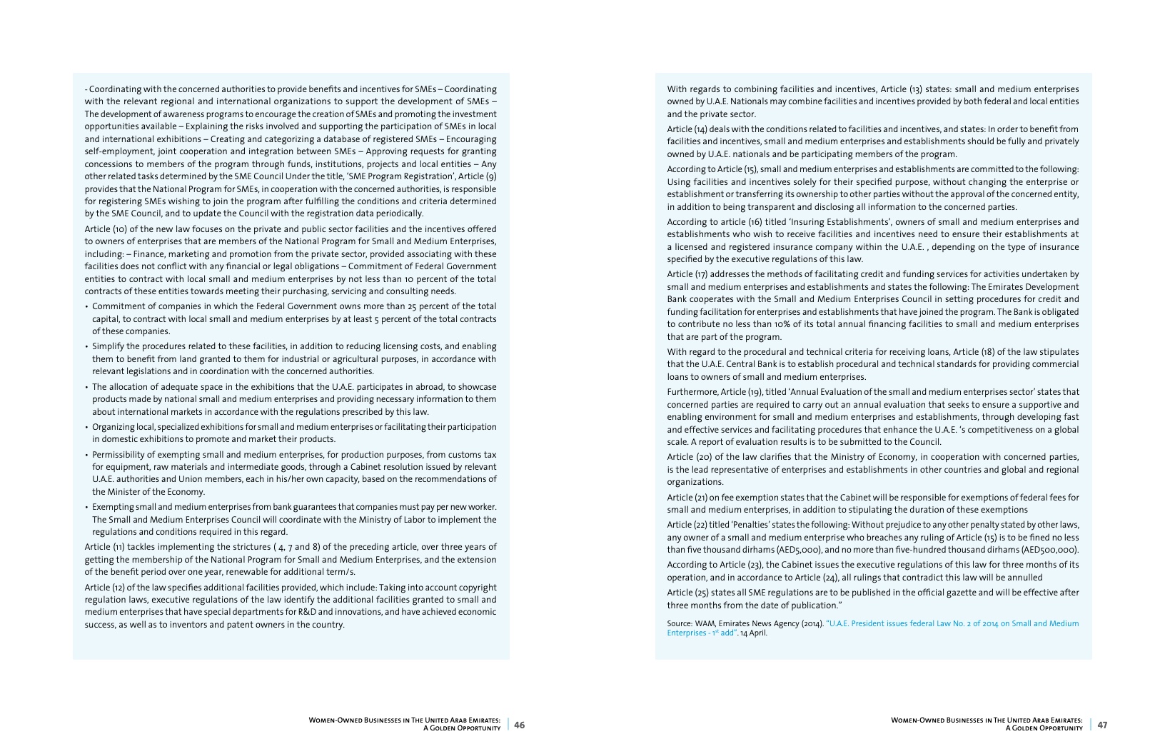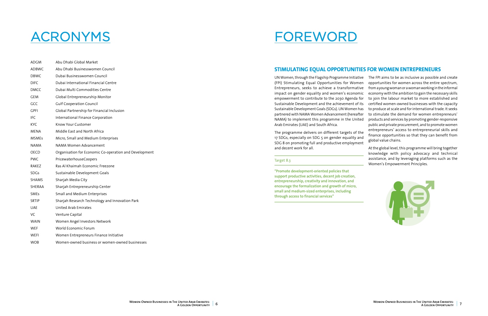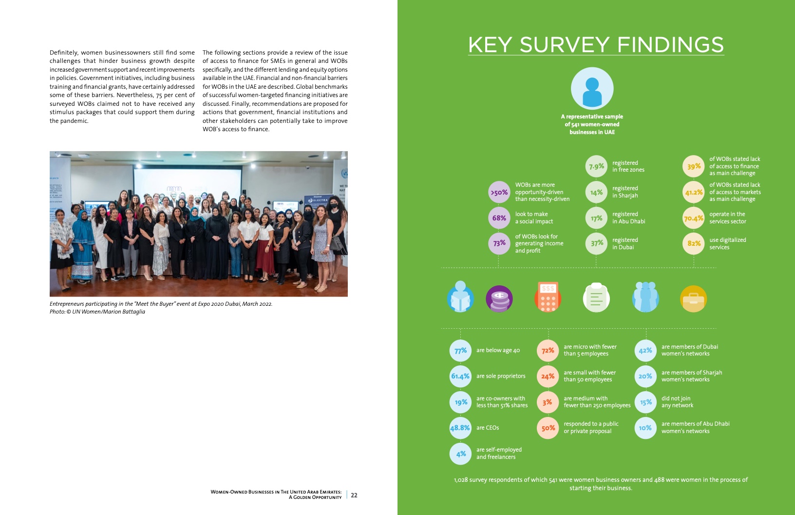 该报告还提供了关于中小型 WOBs的现实情况以及获得融资的可能性的全面资料,并就实现这些目标和推动企业发展提出了意见和建议,指出过去十年来,阿联酋通过一系列法律、政策和制度措施,在公共和私营部门确保两性平等方面取得了重大进展。