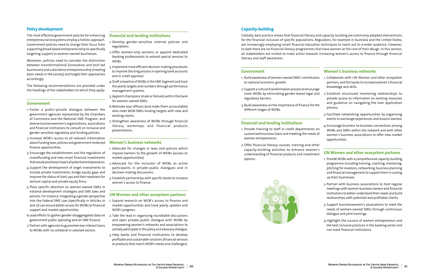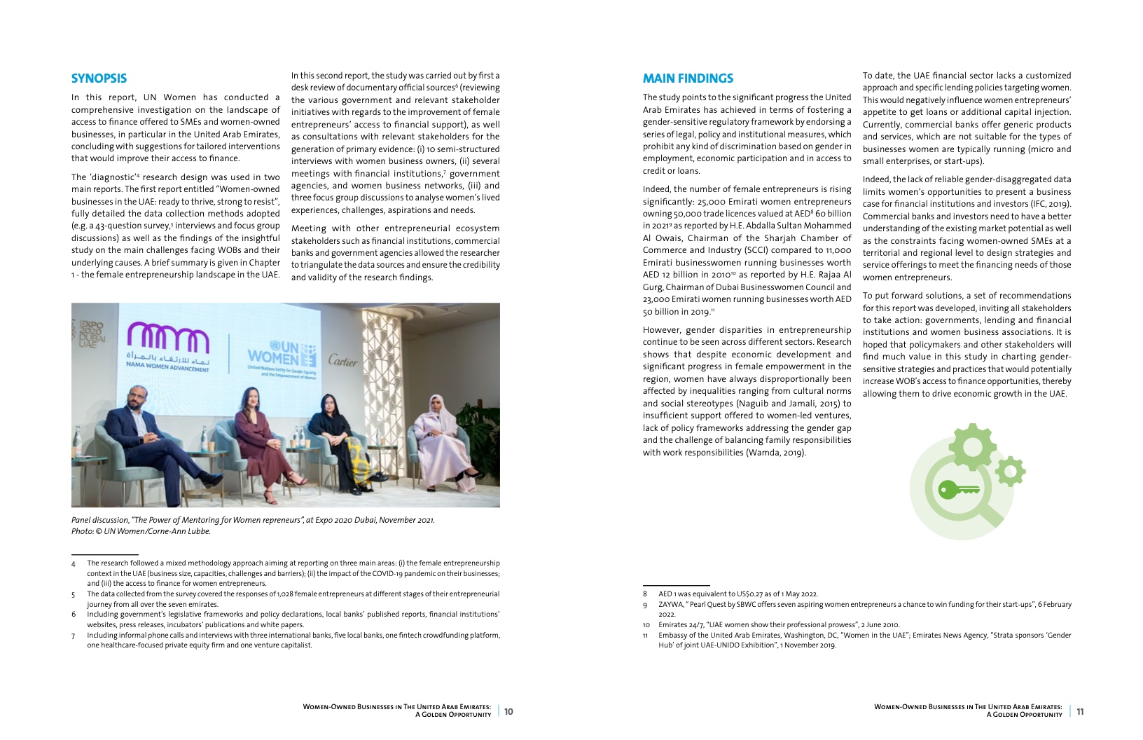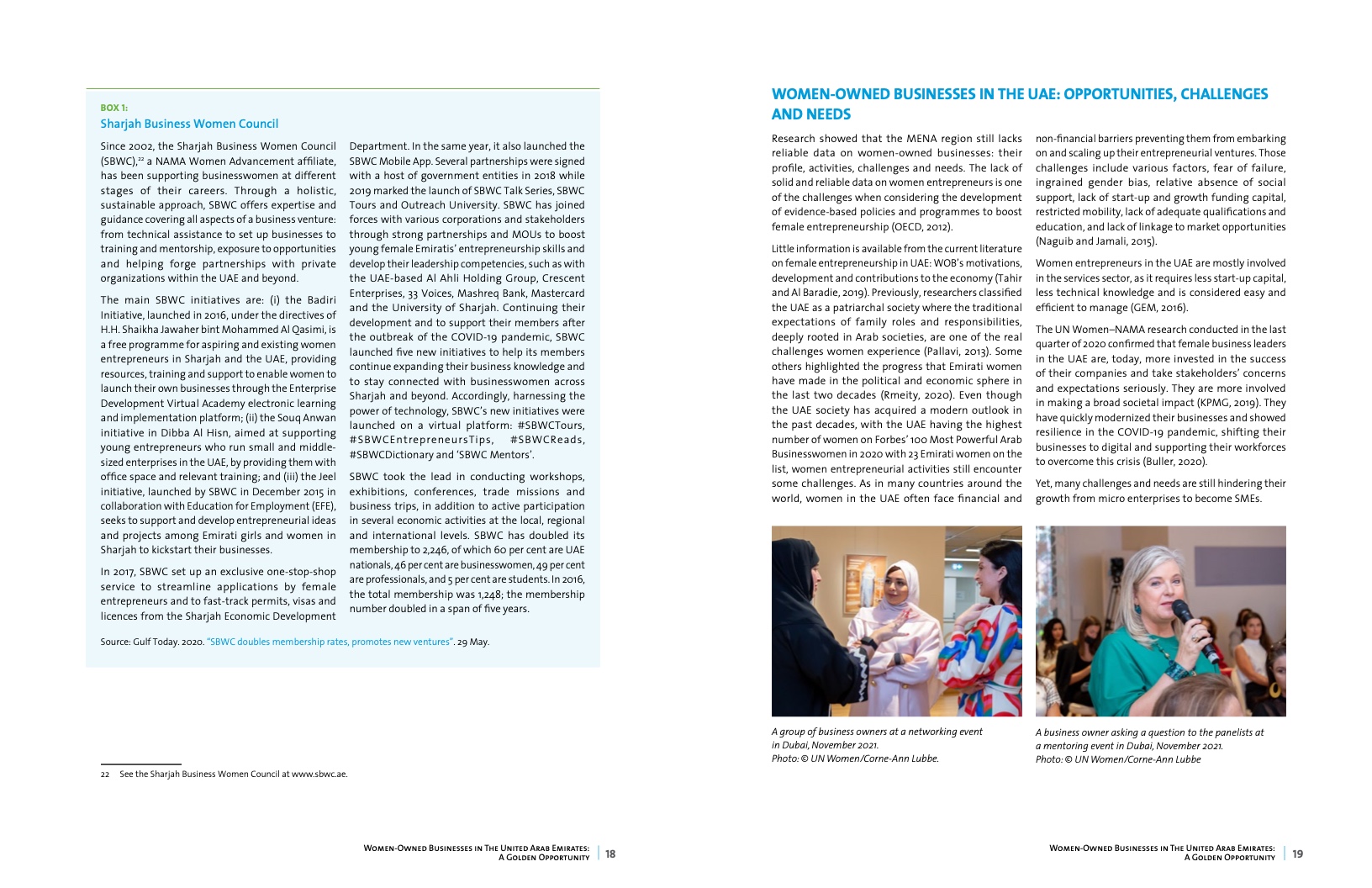 该报告还提供了关于中小型 WOBs的现实情况以及获得融资的可能性的全面资料,并就实现这些目标和推动企业发展提出了意见和建议,指出过去十年来,阿联酋通过一系列法律、政策和制度措施,在公共和私营部门确保两性平等方面取得了重大进展。